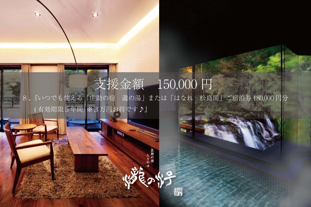 リターン 『いつでも使える「庄助の宿 瀧の湯」または「はなれ 松島閣」ご宿泊券180,000円分 (有効期限5年間)』※30,000円分もお得です♪