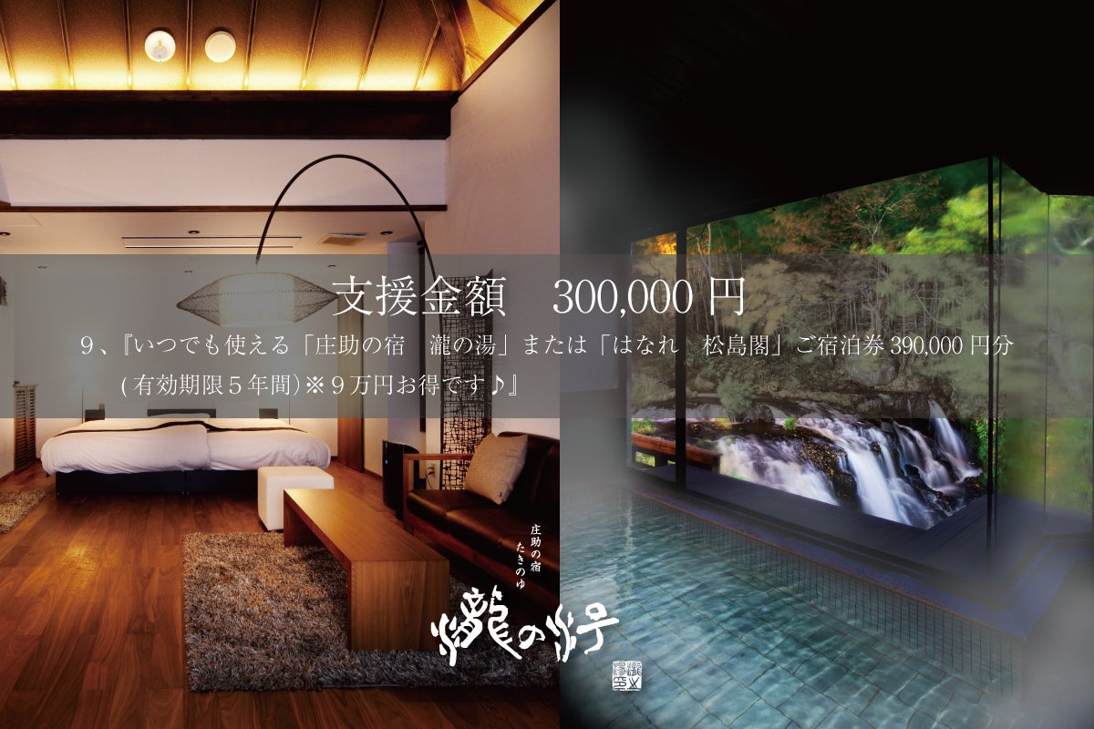 リターン 『いつでも使える「庄助の宿 瀧の湯」または「はなれ 松島閣」ご宿泊券390,000円分 (有効期限5年間)』※90,000円分もお得です♪