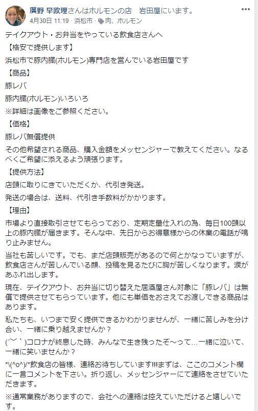 と言い、テイクアウトを中心に営業している飲食店さんに商品を格安で提供し、廃棄が続くレバに関しては、無償で提供していました。苦しい時はお互い様…1円でも商品を高く売ろうと努力するのではなく、みんなで困難を乗り越えるための方法を考える為に時間を使いなさい…というのが、お母さんの考え方です。