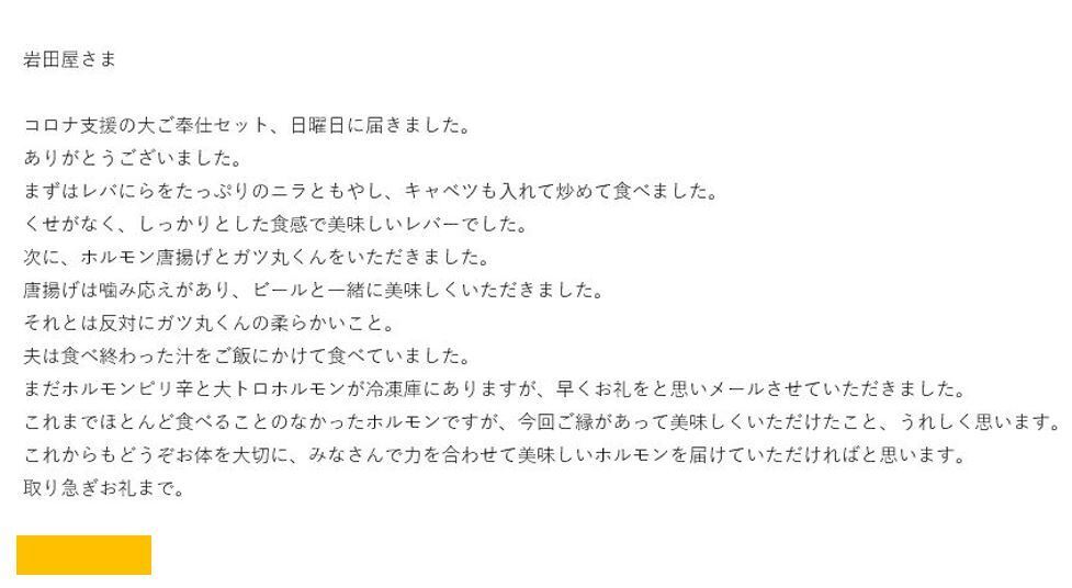 2020/09/02 21:23こんばんは、ホルモンの店岩田屋の雅之です。報告が遅くなってしまい申し訳ありません。今日、社会福祉法人中央共同募金会(赤い羽根共同募金)「令和2年7月3日からの大雨による災害にともなう災害ボランティア・NPO活動サポート募金」へ、クラウドファンディング手数料、決済手数料の合計17%を引いた金額から1割を寄付させていただきました!ご支援のリターンとしてお届けさせていただく商品ですが、○食べ比べセットはインスタントラーメン5食分○お家de簡単調理セットとレバニラセットは食べ比べセットよりやや小さいぐらいのスペースが必要になります。ご家庭の冷凍庫のご都合もあるかと思いますので、日付指定等があればお手数おかけしますがご連絡いただけると幸いです。 もっと見るご支援、本当にありがとうございます。
