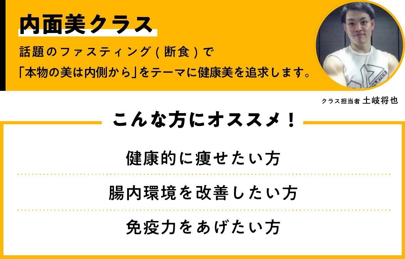 このクラスでは筋力的なトレーニングに加えて、海外のセレブや有名人の間では当たり前になりつつある、『ファスティング(断食)』を今回提案致します。 目的は日頃休み無しで活動してくれている内臓を休める事。そして肌は『内側8割、外側2割』や『臓器の鏡』と言われるように、内側の状態がとても重要です。そんな身体の内側をご自身でコントロールできる知識を身につけ、健康美を追求していきます。 外見はもちろん健康美にも興味があるメンバーに集まってもらい、各々の目標に向かって高め合いながら、楽しく時に厳しくボディメイクをしていくクラスになっています。