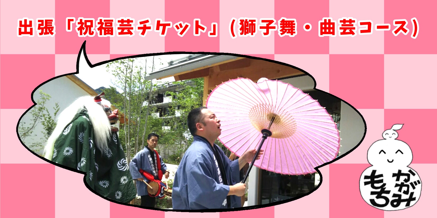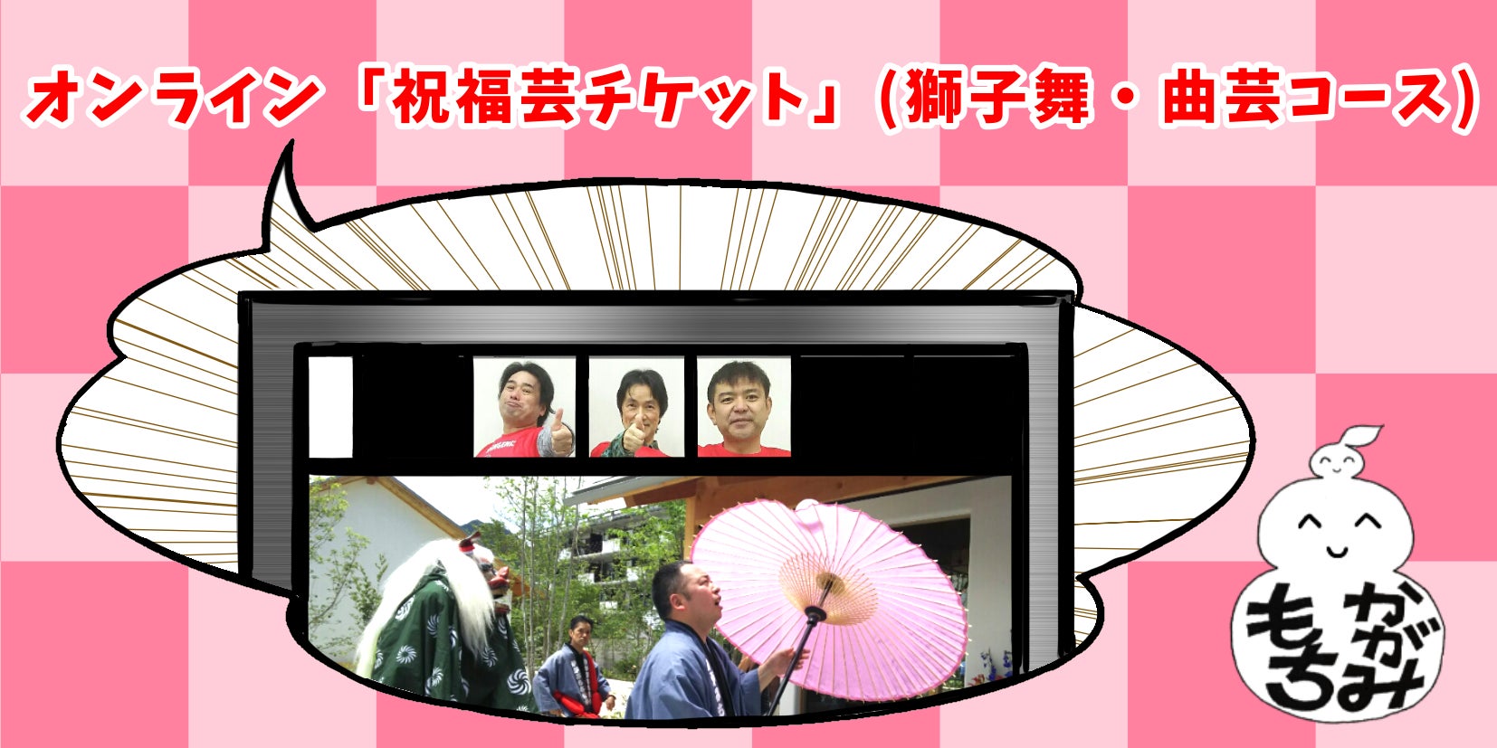 ご自宅で迎える誕生日や結婚記念日、還暦祝いなどの特別な日に、おめでたい芸能をあなたのためだけに、双方向で生中継し、貸し切りで披露する予約券です。傘の上で升を回して人生末広がり、笛と太鼓の生演奏の獅子舞で厄払い。江戸時代から続く祝福芸で、皆様の家内安全・商売繁盛・無病息災を願います!破格のお値段、今だけの大サービスです!!