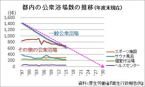 公衆浴場(銭湯)は街から姿を消しつつあります。東京都においては、1975年には2500件あった銭湯、2000年には1400軒、そして昨年にはついに500軒(令和元年時 473件)を割込みました。こうしている間も、廃業する銭湯は後を絶ちません。私たちは、銭湯文化を伝えるべく、廃業をするわけにはいかないのです。