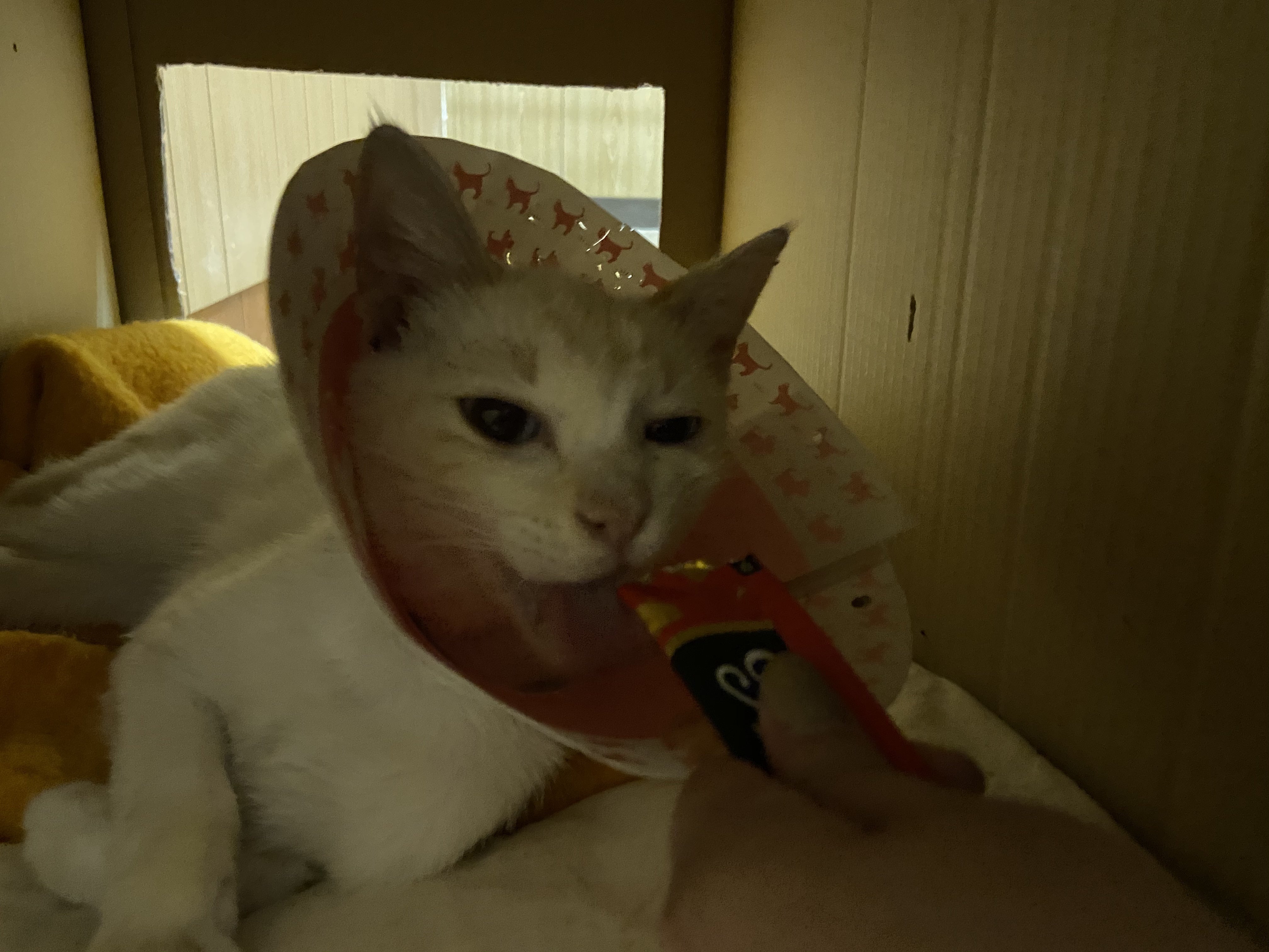 今はだいぶ落ち着き、力作の段ボールハウスの中でいただきもののチュールを頬張っています。
