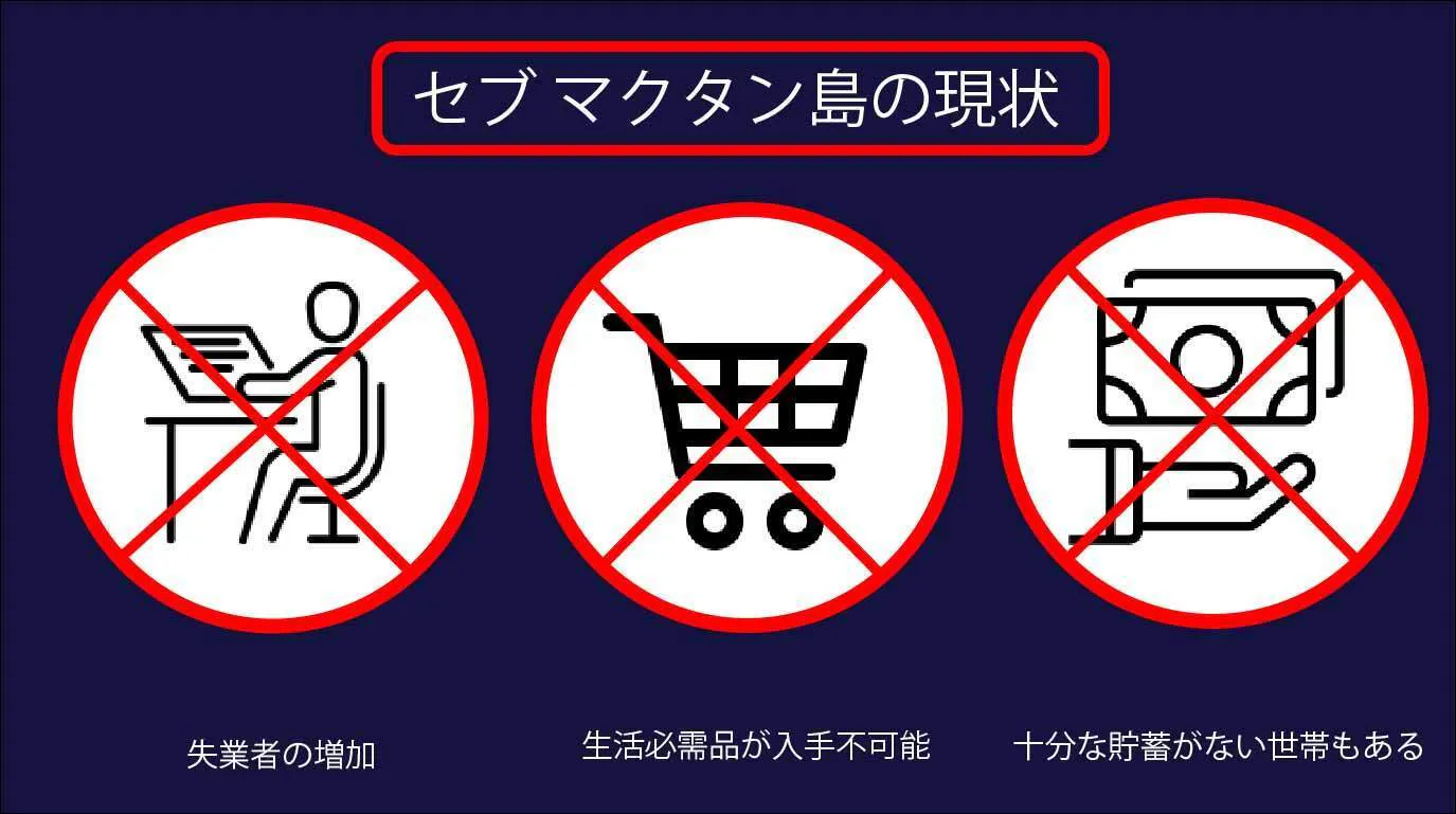 新型コロナウイルスは日本で猛威を振るっています。しかしその影響は「世界中」に広がっています。フィリピン・セブはリゾート地として有名で訪れたことがある人、訪れたい人が沢山いるのではないでしょうか。高い経済成長を続けてきたフィリピンですが、国内人口の21.6%、約2300万人が 1日に100円以下で生活しています。(厚生労働省, 2018)