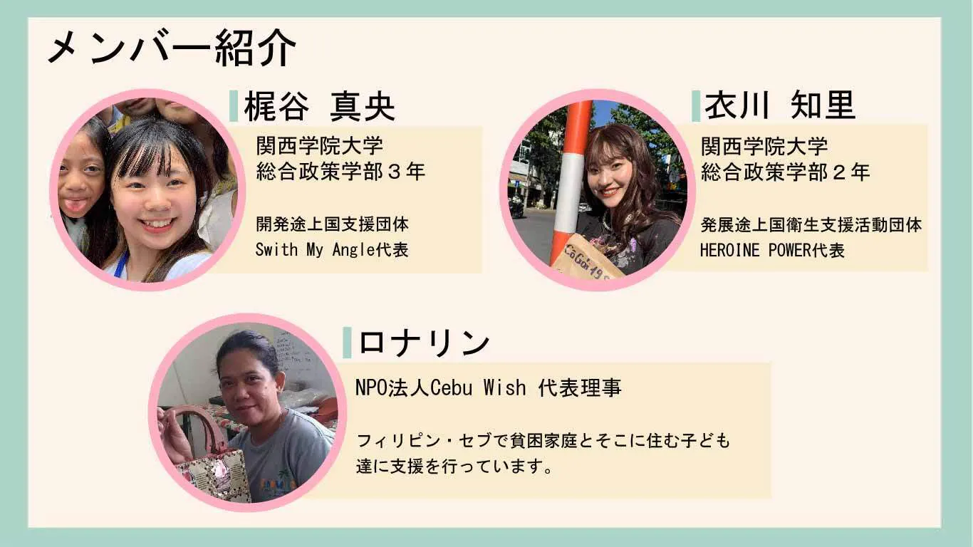 わたし達は関西学院大学アカデミックコモンズ・プロジェクトでフィリピン・セブへの支援活動を行っています。梶谷は開発途上国支援団体Switch My Angleの代表として、フェアトレードアクセサリーの製作・販売活動を行っています。衣川は発展途上国衛生支援団体Heroine Powerの代表として性教育を受けていない男女の子どもたちに生理と衛生に関する知識を伝える活動を行っています。