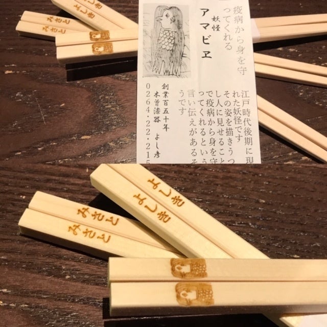 ご支援誠にありがとうございます!今日は、木曽五木の一種木曽ひのきの「アマビエ箸」をご紹介させて下さい。【木曽五木】は、ヒノキ、アスナロ、コウヤマキ、ネズコ、サワラの5種類の常緑針葉樹林のことを指します。江戸時代に尾張藩により伐採が禁止された木曽谷の木です。木曽五木のうちの一種「木曽ヒノキ」の箸に、疫病から身を守ってくれる【アマビエ】を焼き印してあります。5文字までなら、お名前をお入れしてお送りいたします。コロナ感染症から支援者の皆様の身を守っていただきたいとの思いから、こちらの返礼品をご用意させていただきました。
