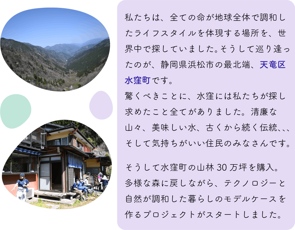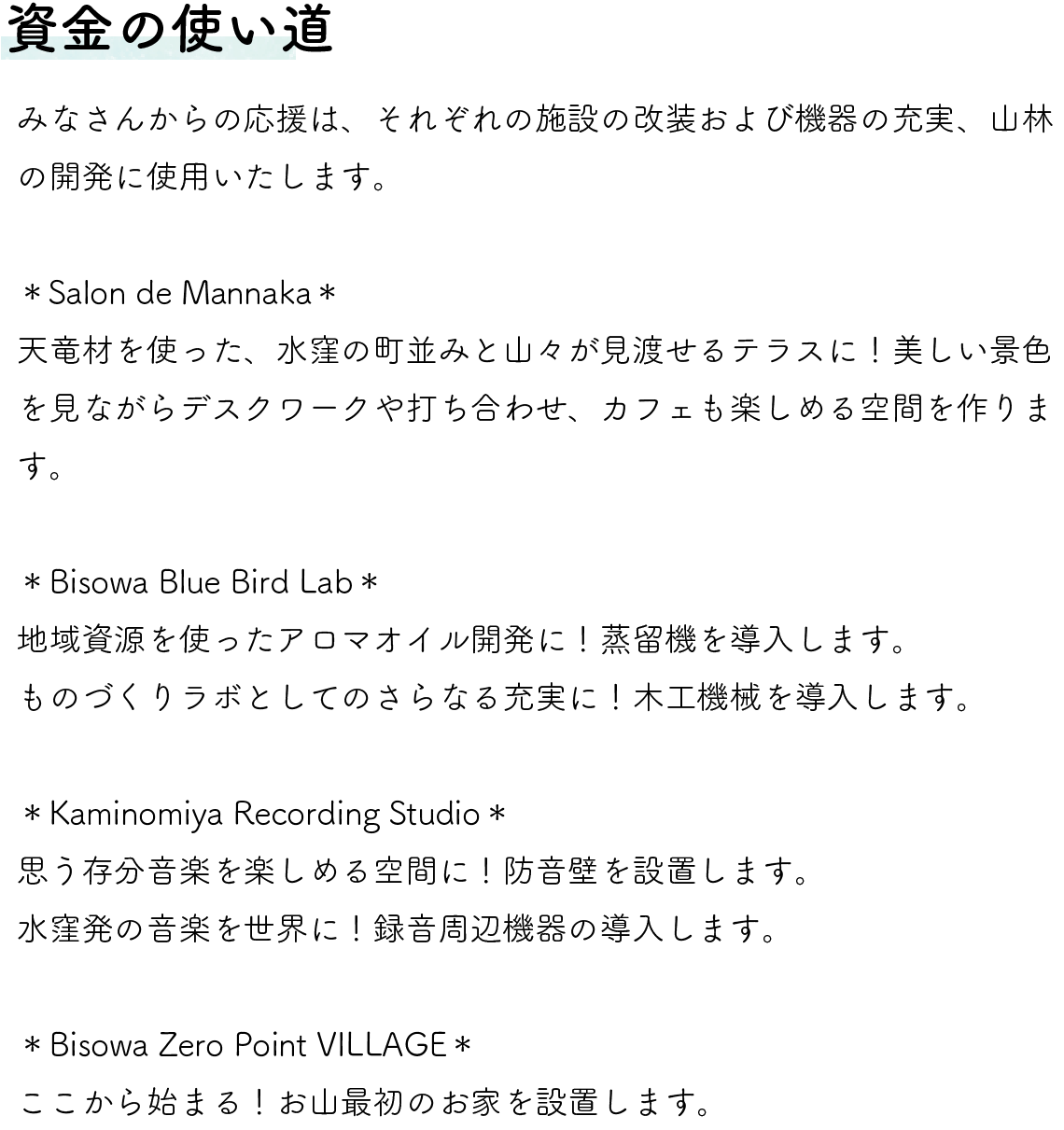2020/07/20 10:34こんにちは。Bioswaプロジェクトです。いよいよクラウドファンディングも最終日となりました。今回の活動報告では私たちのビジョンを、改めてお話しさせていただきます。全ての命の幸せが実現した、その先には?私たちが体現したいと考えているのは、「全ての命の幸せが実現した、その先」の世界です。森に多様な草木が再生された、その先。自然の循環が保たれた、その先。全ての戦争がなくなった、その先。全ての人々が幸せになった、その先。お金が消えてなくなった、その先働く義務がなくなった、その先 …地球全体の好循環、そしてみんなが幸せになったその先の世界でどんな風に日々を過ごし、何が生まれるのか?私たちは、その世界を体験したくて、Bisowaプロジェクトを行なっています。その先には共創の”アソビ”がある私たちが今、抱えている多様な”課題”の全てが解決したら、どんな暮らしをしているのでしょうか?一人一人の幸せが実現し、それらが調和的に繋がっている…そんな世界です。私たちは動物、植物、鉱物、もちろん人間…全ての自然をひっくるめて共創するアソビを楽しむようになってゆくことをイメージしています。全ての命と呼応しながら、歌い、踊り、表現する、そんなイメージです。その先を体現したモデル地域から発信する地球全体で実現する未来に向けて、私たちはその姿を体現し、提案していきたい。そんな思いから、地球循環型の暮らしの基盤となる場を探す中で、浜松市の水窪という街にたどり着きました。驚くことに、水窪には全てがありました。コミュニティや自然と呼応する素晴らしい伝統があったのです。素晴らしい土地や人々、文化とともに、未来、さらなる充実へと進んでゆけることが、町を越え、地域全体に循環のモデルケースとなると確信しています。皆さんは、幸せの「その先」にどんな暮らしを想像していますか?もし、イメージがあるなら(なくても笑)ぜひ一緒にその世界で遊びましょう!私たちへの活動へのご参加、楽しみにしています。Bisowa プロジェクト もっと見る