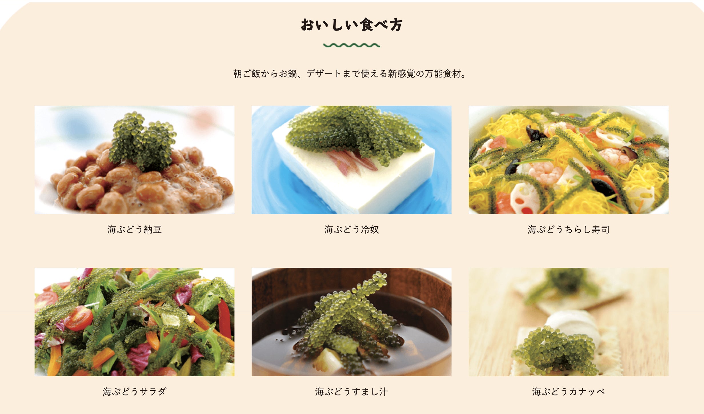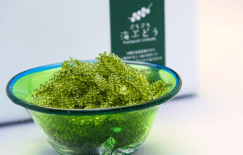 海ぶどうはクビレズタという海藻の一種で、果物のぶどうの房の形に似ていることから名付けられたそうです。プチプチとしたキャビアのような触感が特徴で「グリーンキャビア」とも呼ばれています。