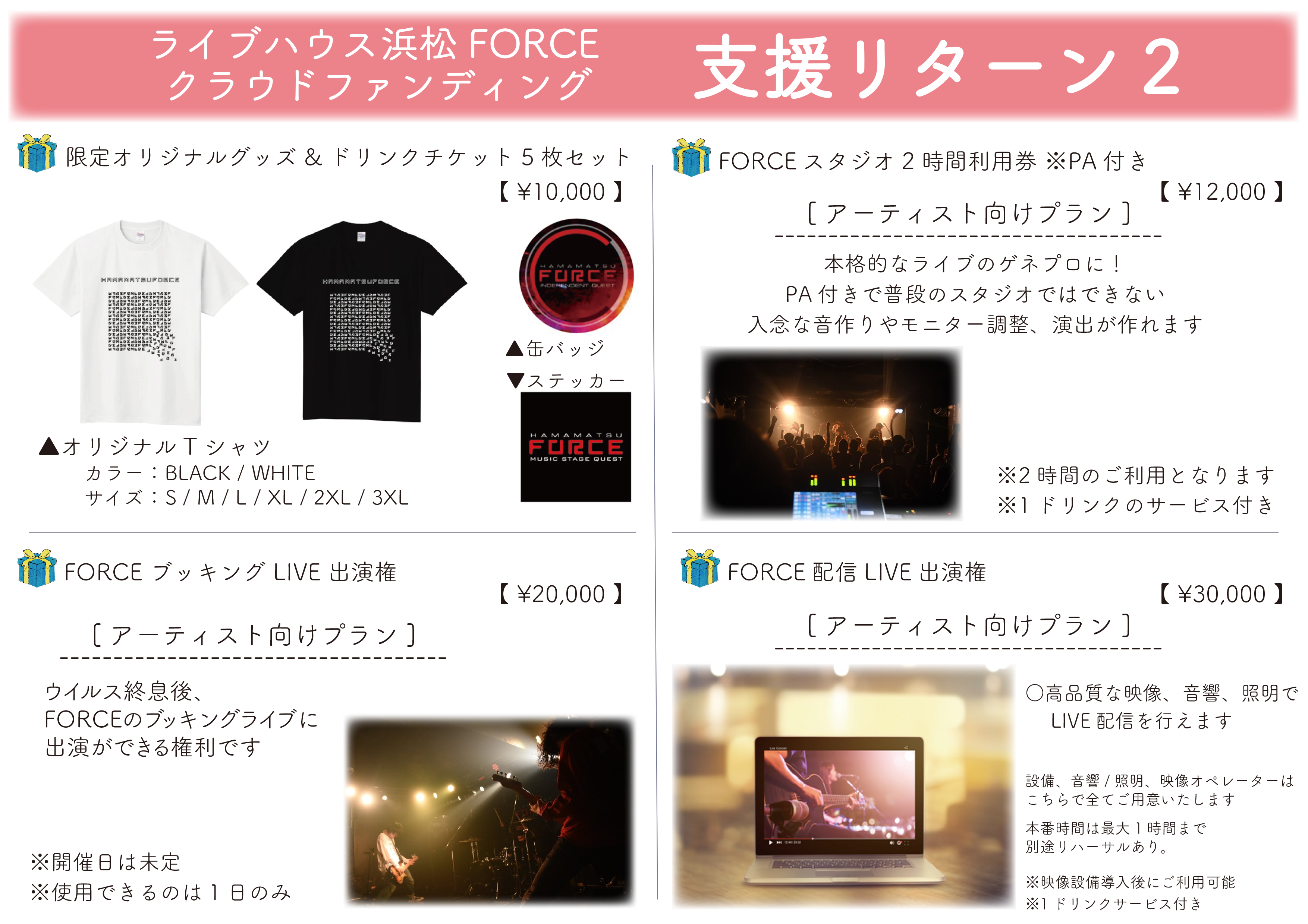 様々なご支援を頂いており、状況がまだ続くとライブハウスの存続が難しい状況にあり、ご支援頂いている方々や浜松FORCEに日頃から来てくれている音楽ファンの方々に恩返しや空間の提供が出来なくなってしまいます。