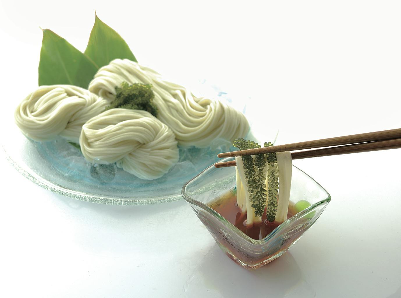 海ぶどう麺は海ぶどうの粉末を入れて、吉野葛を入れているので、もっちりしたとても美味しい奈良県の製麺所で作って頂いております。粉末は自社で製造しております。