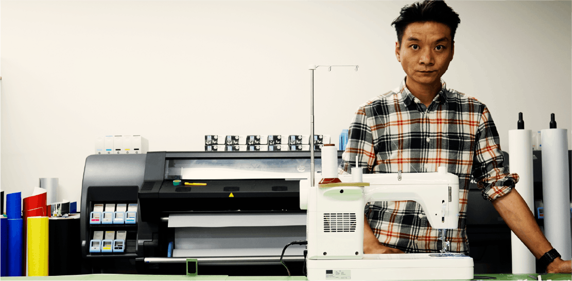 裁縫技術は、昨年導入したヴィジュアルファブリックウォールという生地を使用した電飾看板で培った技術です。社員から集まった発想から、今まで印刷してきた紙や塩ビシートではなく、新たな合皮素材を取り入れ、印刷技術のノウハウと裁縫技術を結集した新たな製品を生み出しました。