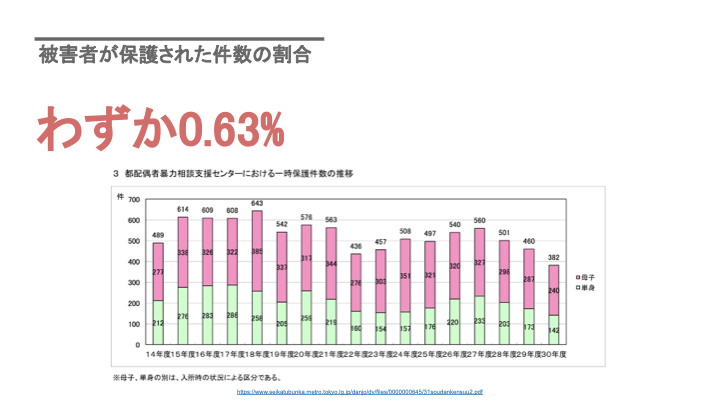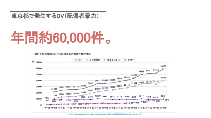 東京都内には年間で把握出来ているだけでも、DV被害約6万件、モラハラ被害約16000件、性犯罪被害約900件と合わせて約7万7千件と非常に多い被害データがあります。