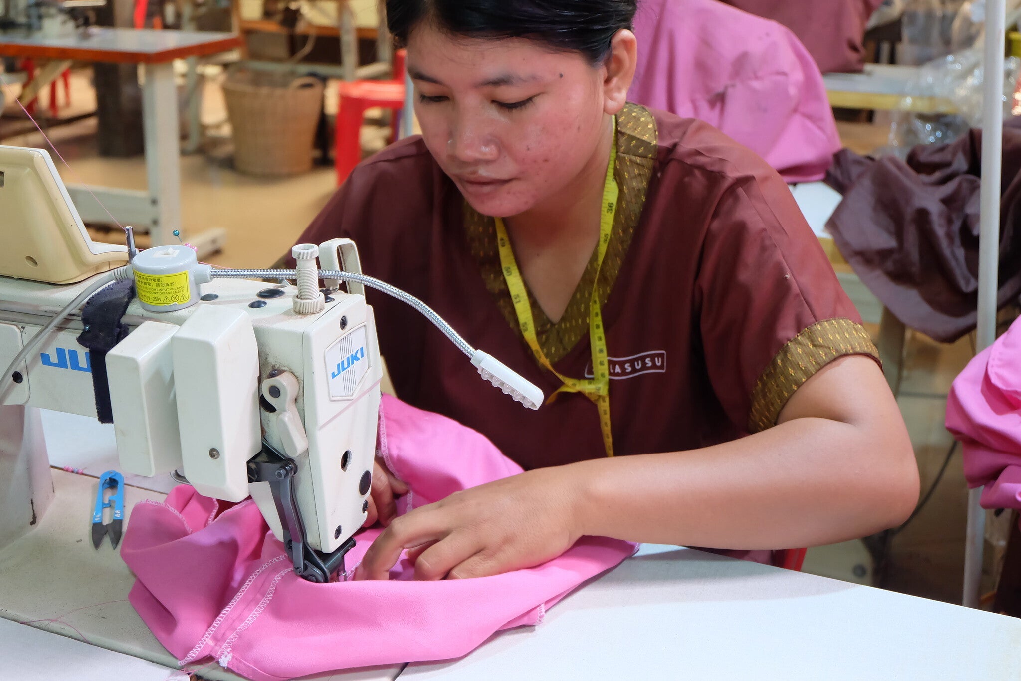 そして、カッティング部門が切った布を縫い合わせるのがミシン部門。これも一つ一つ、手作業で縫っていきます。