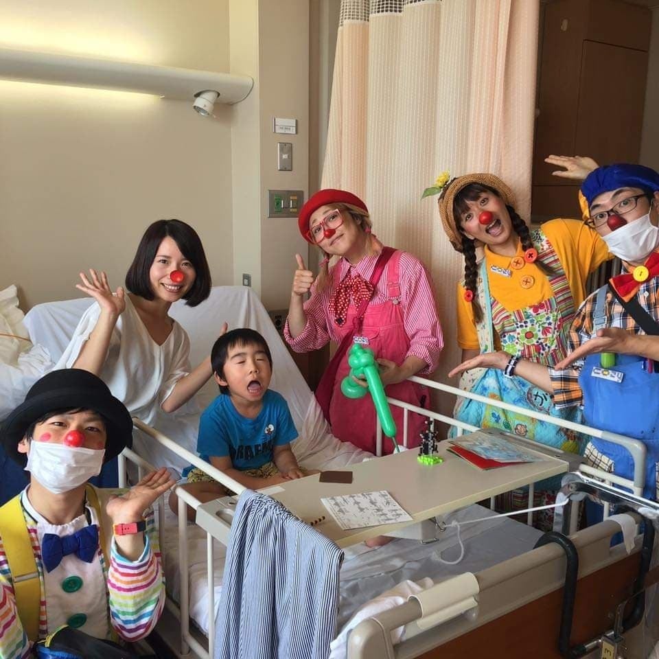 NPO法人日本ホスピタル・クラウン協会は、闘病中の子ども達に笑顔を届ける活動をしています。赤い鼻をつけたクラウン(道化師)が小児病棟で子ども達一人一人に合わせたパフォーマンスをしています。全国96病院を各病院、月に1〜2回、160名のクラウンが定期訪問しています。私たちは、長い闘病生活の中で子どもたちは成長していくと考えた時、病院を子どもの社会と考え、そして「病気の子ども」ではなく、「子ども」に意識をしてパフォーマンスをします。