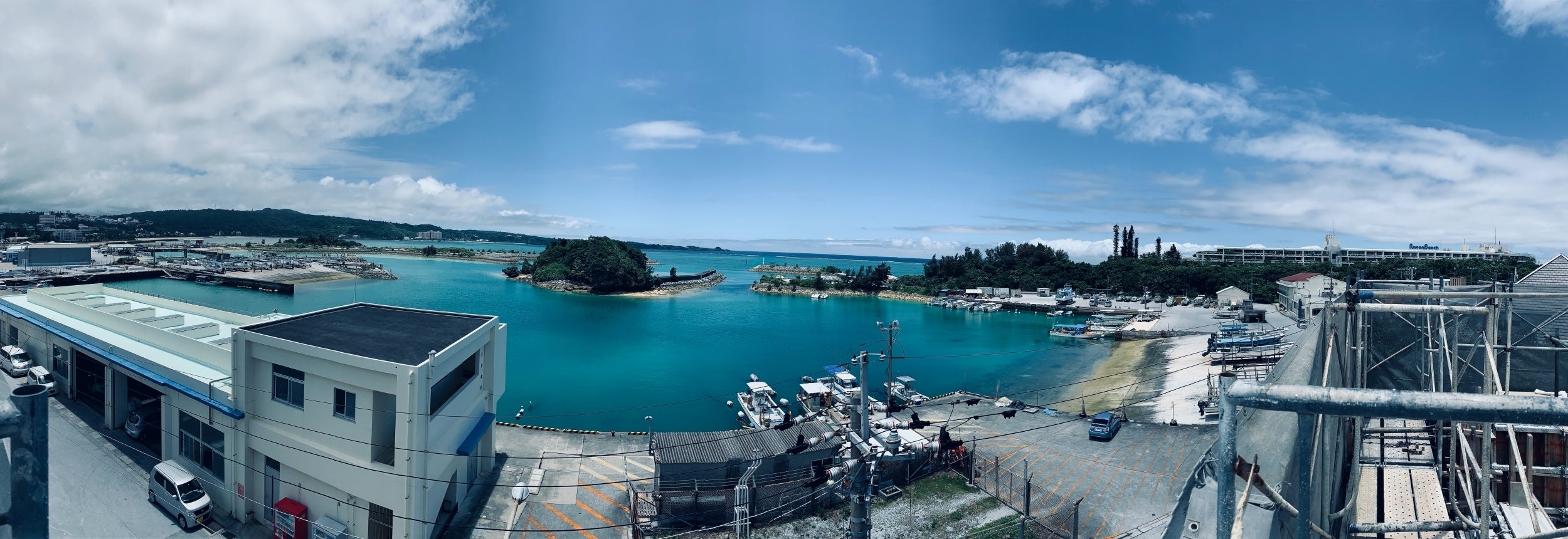 店舗建築場所の近隣にはリゾートホテルが立ち並び、建築地の前兼久漁港内にはマリンスポーツの為に年中数多くの観光客が賑わってます。
