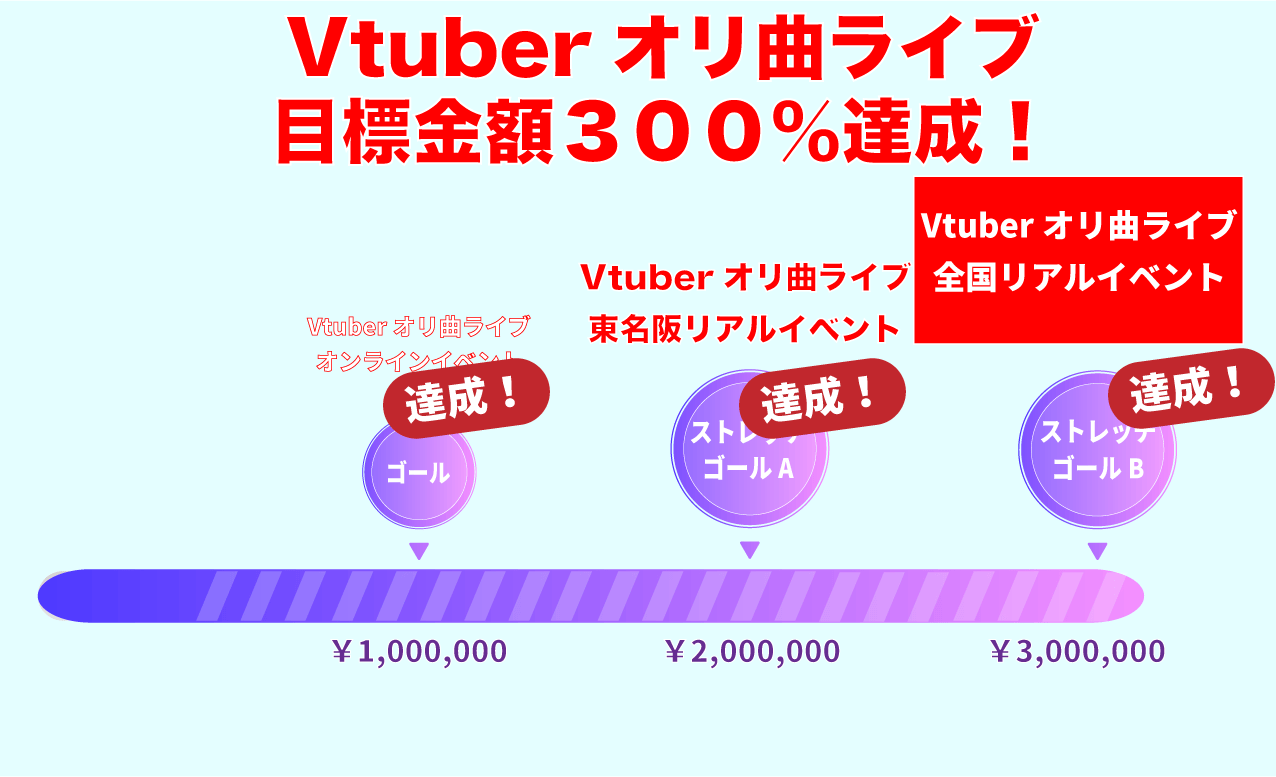 目標金額300%達成により、現在は東京・名古屋・大阪+3箇所でのリアルライブイベントが開催可能になっております。