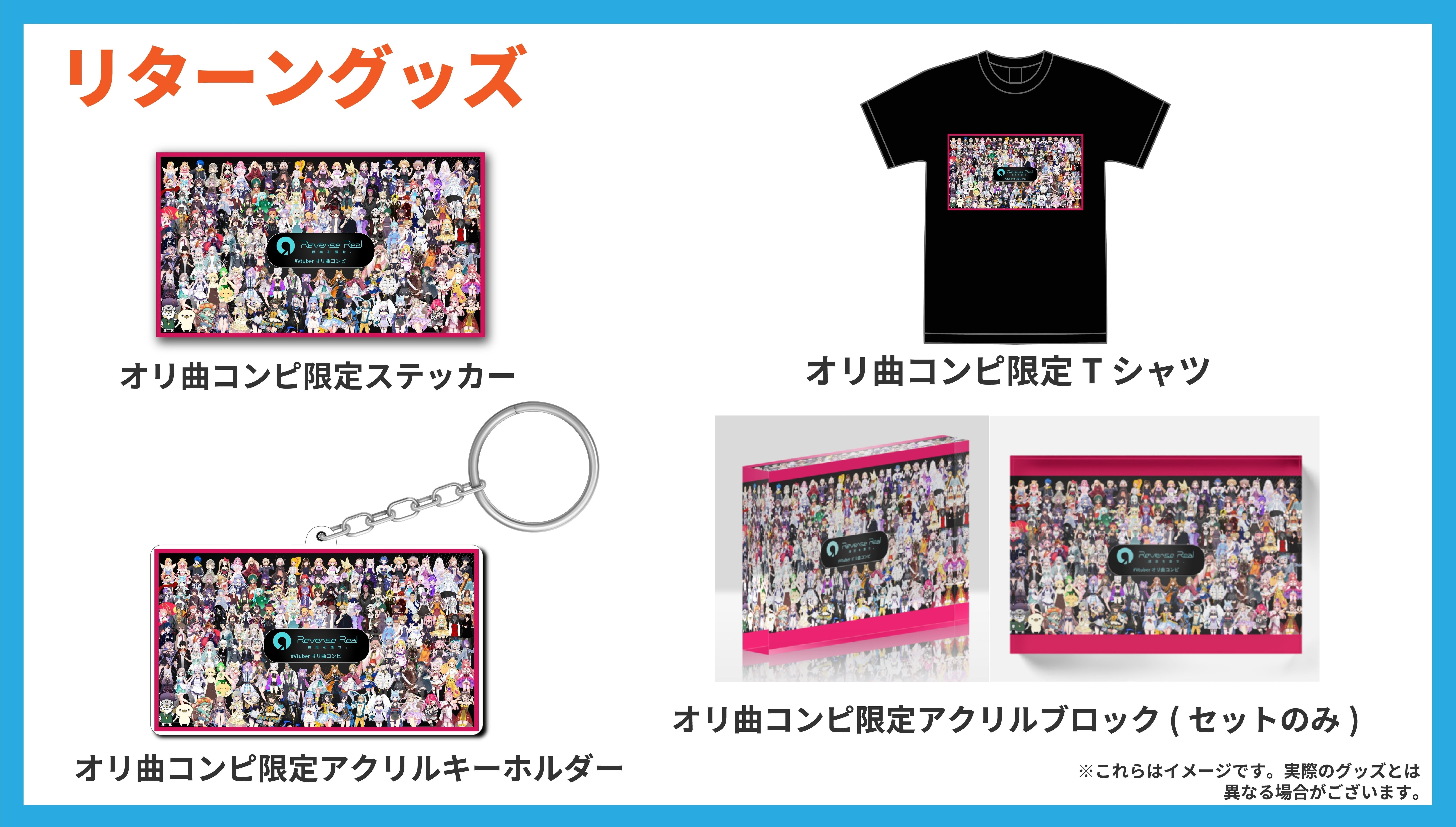 オリ曲コンピ第2弾限定集合絵のステッカー・アクリルキーホルダー・Tシャツ・アクリルブロックをお送り致します。