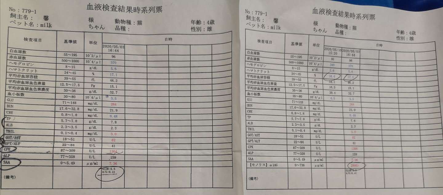 2020/06/10 23:35みなさんご支援や拡散のご協力、そして温かいメッセージを頂き、誠にありがとうございます。最近授業が始まり、ミルクちゃんの治療は続けています。活動報告が遅れでしまい、申し訳ございません。毎日注射している副作用で足が歩けなくなっていた5月後半、ミルクが血栓と似ている症状が起こりまして、朝5時くらい急に入院しました、カプセルタイプの薬の量が足りなくって、副作用も起こりそうな感じでしたので、6月から注射用の薬に変えました。費用がカプセルより高いですが、目標金額は変わらないままで行きたいと思います。超えた費用は自分で負担したいと思います。薬が苦すぎで、口から泡を吹き出した現在、ミルクの状態がよくなっています。貧血、食欲も回復し、腹水が減っていくにつれ、体重が3.6kgまで増えました。ただ、なぜか最近胃の状態が弱くって、栄養缶詰めが食べると下痢になります、なので、医者さんから整腸薬ももらいました。毎日注射をするのは苦しいですが、皆様のご支援のおかけてミルクはよく頑張っています。皆様から頂いた支援金は全て注射用の薬の費用に充てさせて頂きます。ミルクを心配してくださり、本当にありがとうございます。こちらは5月25日の検査結果になります。この時点で貧血、腹水、黄疸はすべてよくなっていましたが、炎症の数値はまだ高いです。そのために引き続き皆様のご支援をどうかお願い致します。(またインスタではミクル最新状況や写真を載せますので、良かったらぜひフォローしてください) もっと見る