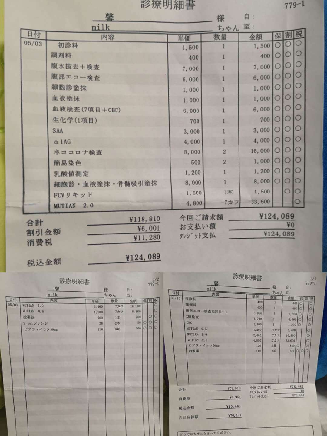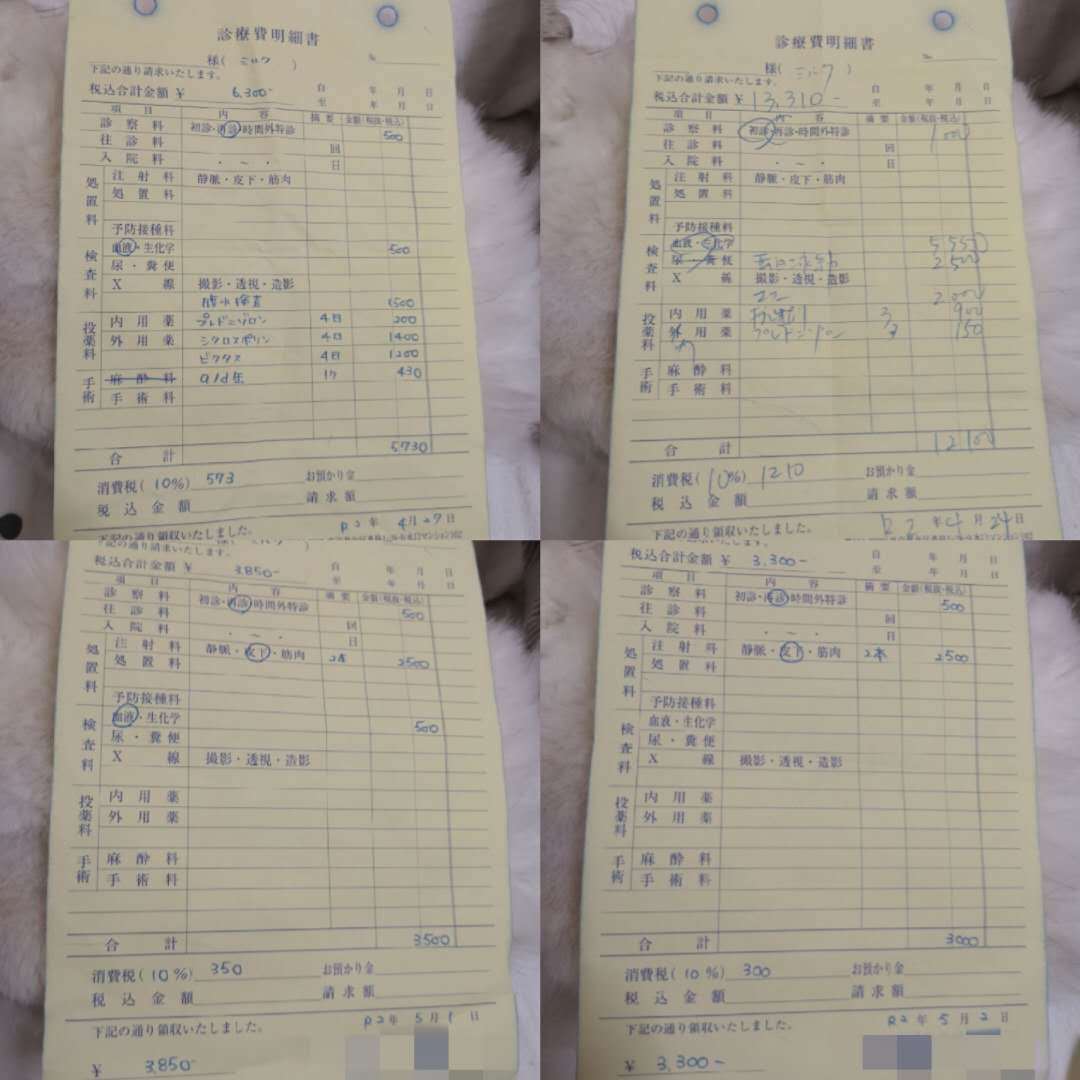 これは5月3日から5月10日まで通ったの動物病院の診療明細