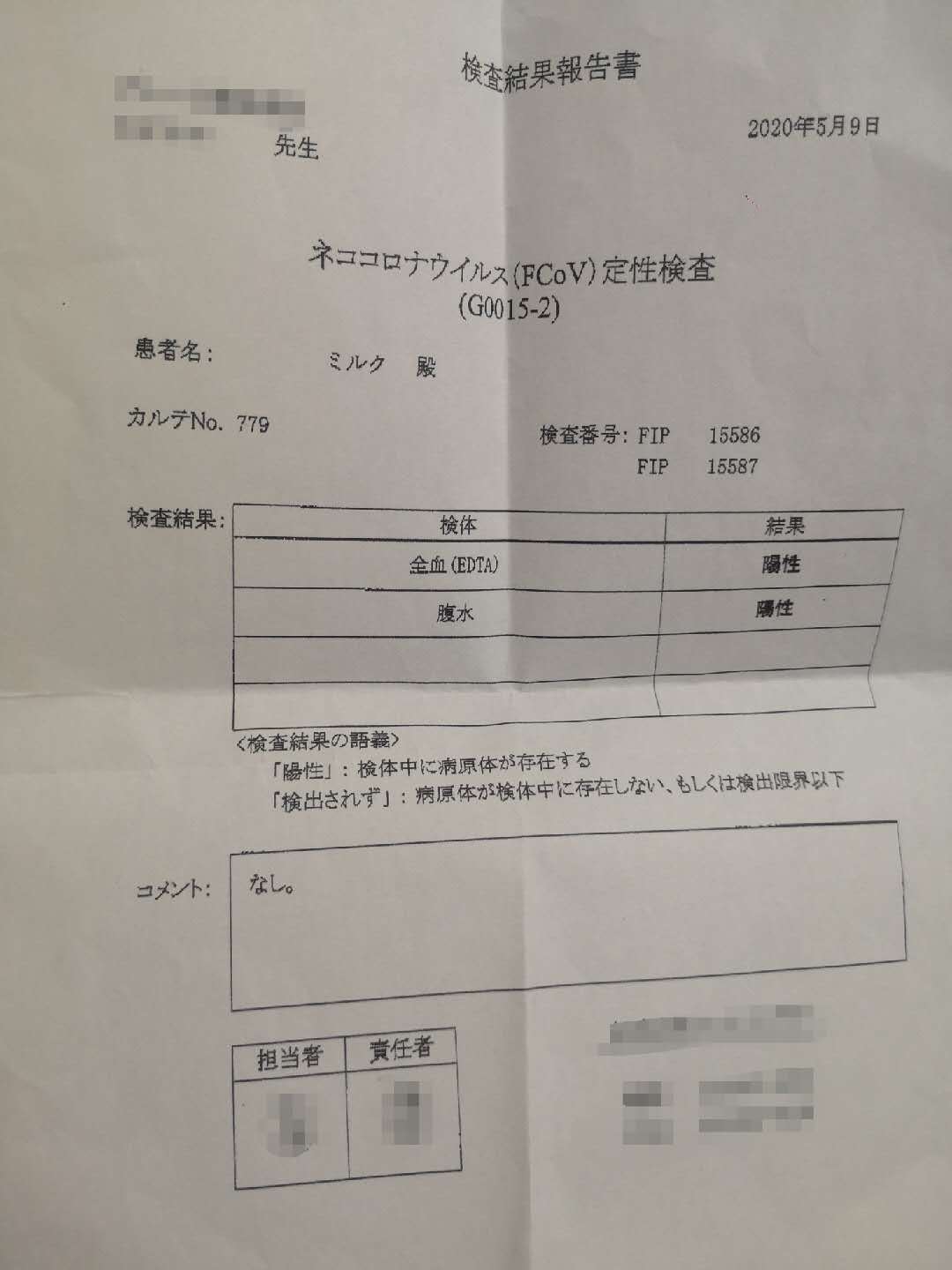 4月中旬頃からミルクの食欲不振、お腹の大きさの変化に気づき、4月24日に最初の動物病院で診察したところ、腹水、貧血が診断され、FIPの可能性もあると告げられた。精密検査をし、結果を待つ一週間の間、突然死を防ぐため、プレドニゾロン、ビクタス、シクロスポリンを処方されました。腹水は減ったものの、体重が4キロだったのが2.85キロに減りました。1週間後先生に「FIPです。このままだと1か月持たないでしょう」と告げられました。