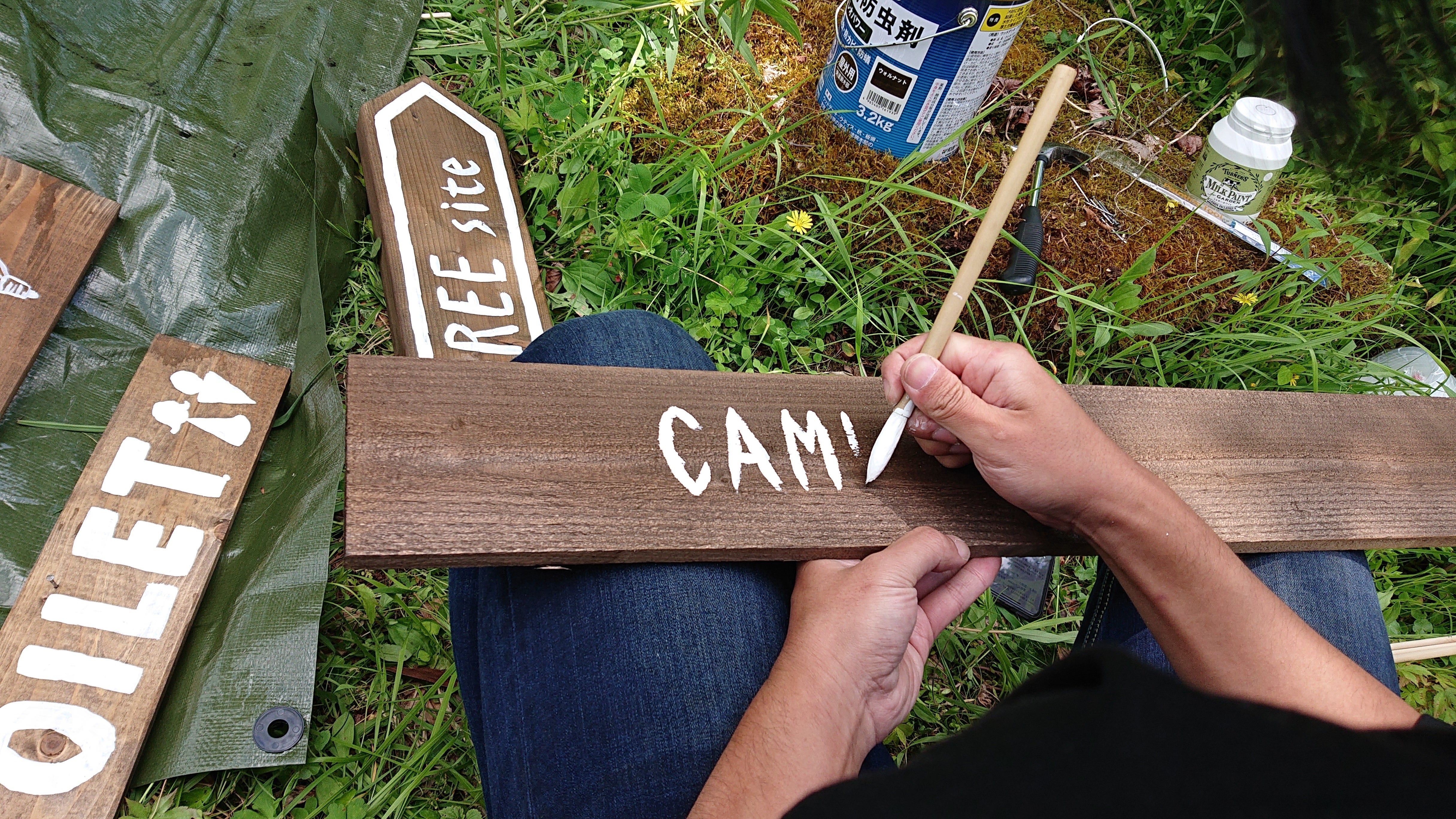 さて、デザイン&プランナーチームの作業会場内の案内看板の製作に入ります。整地も進み、大体のエリア分けの目途もたってきました。なので、会場内のサイトの案内看板の作成も同時進行です。次々と手書きの看板を仕上げてくれるデザイナー。温かみのある標識です。そして、この看板を会場内の木に設置‼立て続けに、ハンモックエリアも開拓中‼ハンモックに揺られて過ごす快適な空間を作ってます。楽しみにしてください。