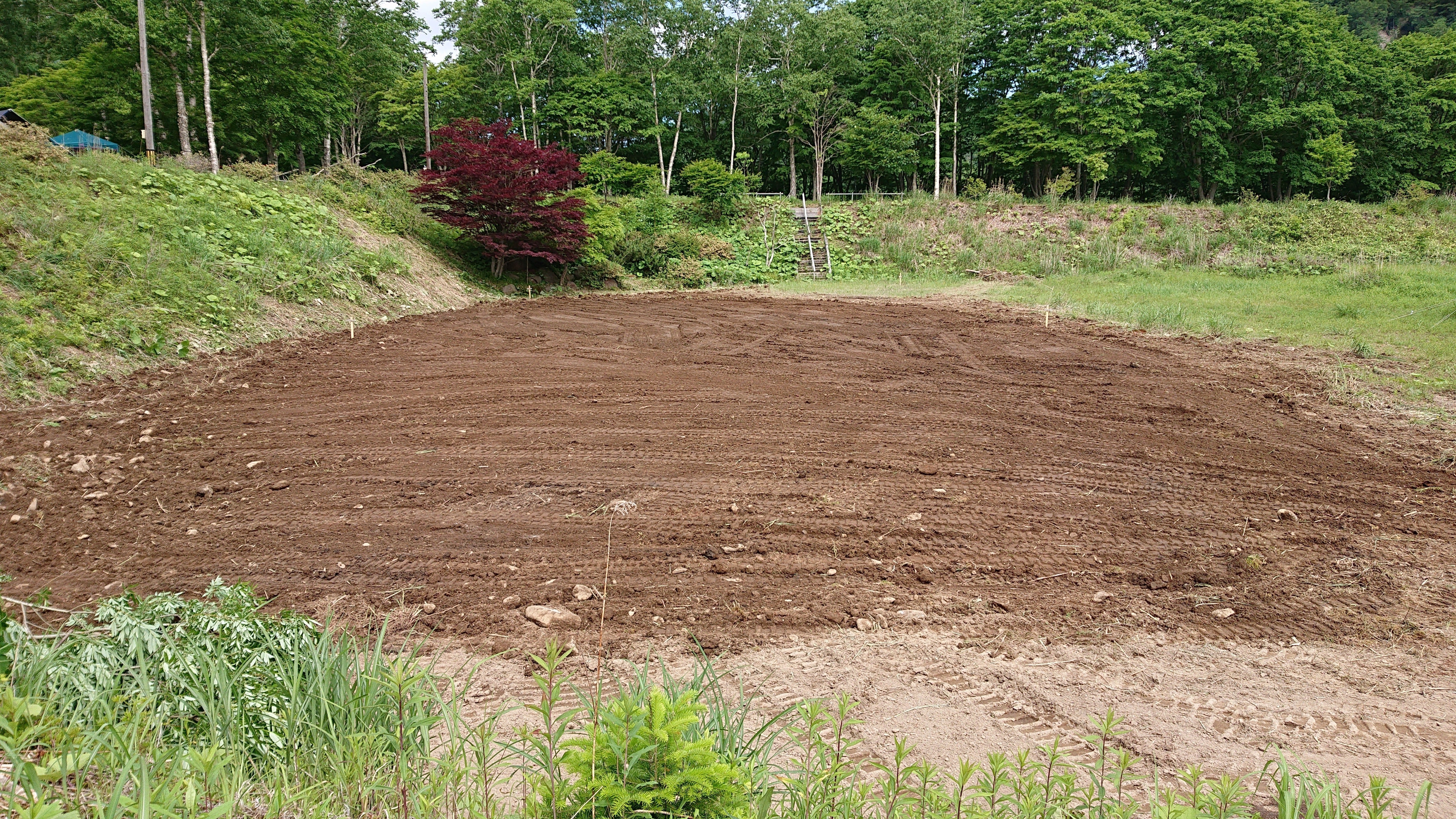 お子様たちの遊具エリア予定地。小さな山がボコボコあった土地を、一人でしかも1日ちょっとで整地する職人ってやっぱりすごいです。見ていて気持ちがいい!本当に感謝感謝です。そしてさらに新たにできるのが、キャンプ場崖の下に流れる白老川までの遊歩道。カッコウの鳴き声が心地いい散歩道。しばらく歩くと…白老川に到着します。この道のりが意外と楽しい!このエリアではブッシュクラフトなどのワイルドキャンプを楽しんでもらおうかと。夏場はアウトドアサウナも企画しようと思っています。