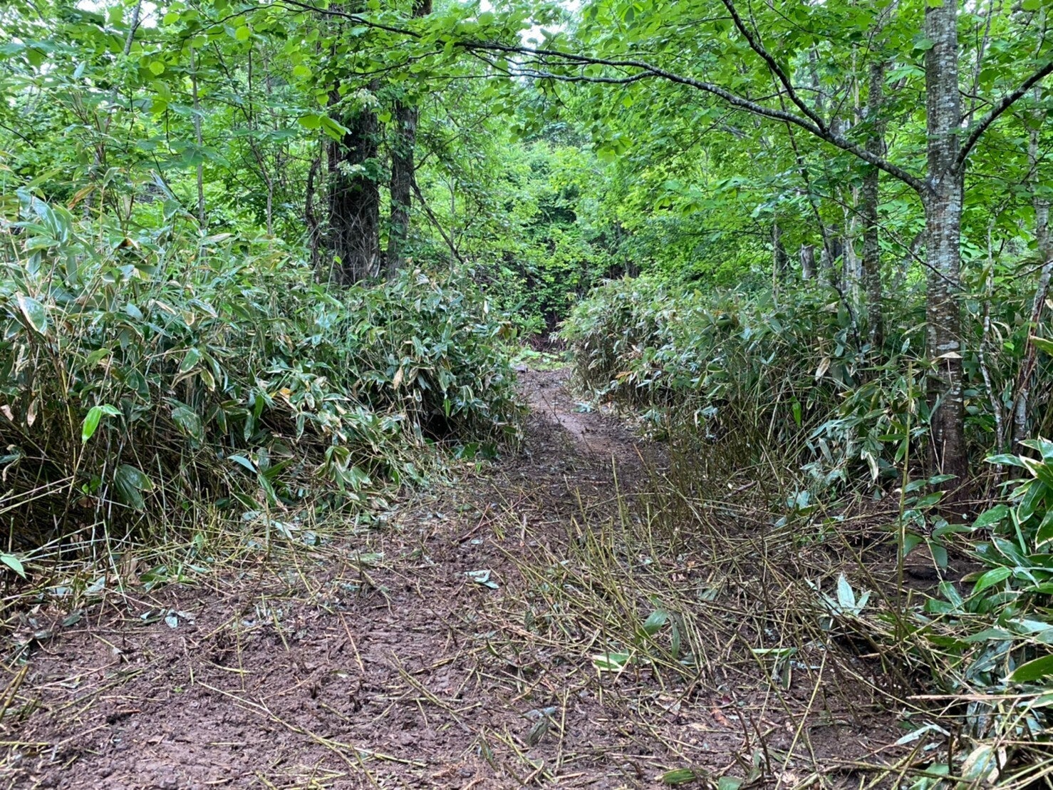 散策路を開拓中です。「森野トレイル」とでも名付けようかな。笹竹を刈って刈って刈って刈って刈って…。均して均して均して均して…。ようやく開けてきました!そう。ここは以前動画で紹介した白老川のエリア。水流が多ければ川下りもできるみたいです。知らなかった…。森の鳥たちのさえずりを聞きながら散歩できる、とても気持ちの良い散策路です。
