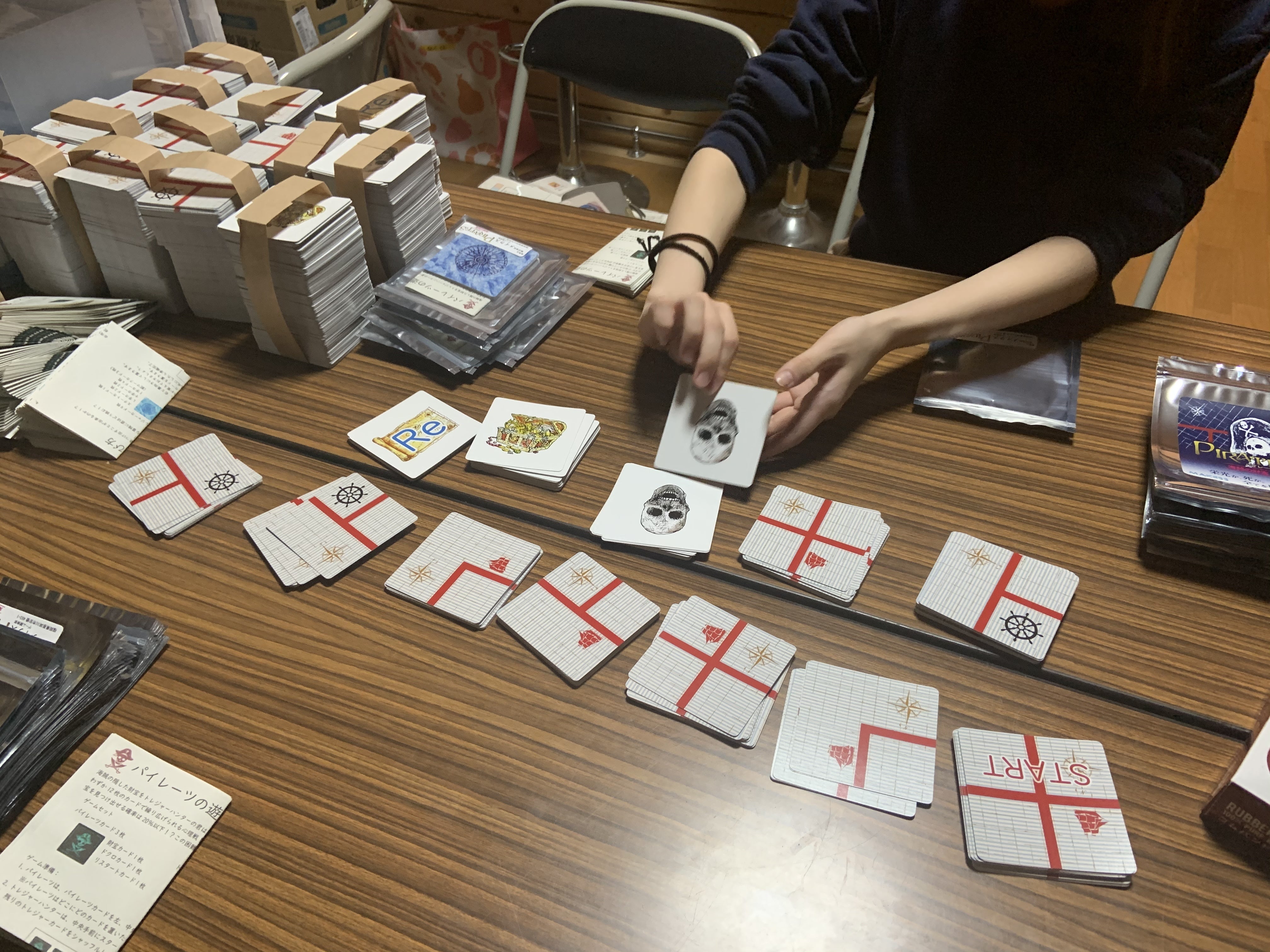 2020/05/17 21:45これまでご支援いただいている皆さま、ありがとうございます!パイレーツ、明日から販売開始です。印刷とカットだけは業者さんにお願いしましたが、経費削減のため、角を落とす作業とカードを1セットずつ並び替える作業は自分たちで少しずつ行っています。ようやく昨晩500セットが完成し、なんとか発売開始予定日に間に合いました!まだまだこれからですが、少しでもたくさんの方に遊んでいただけると嬉しい限りです‼︎今後商品化予定のカードも、私たちの手で丁寧に封入作業をしてお届けしていきます。応援よろしくお願いいたします‼︎ もっと見る