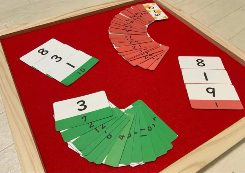 カードをシャッフルしたら1人につき3枚手札を配ります。手札に書かれた数字と +・ー だけを使って、お題カードに書かれた数字になるような数式を考えます。
