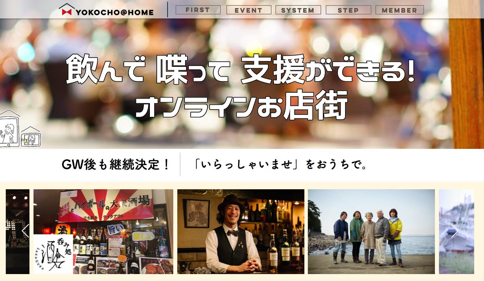 YOKOCHO@HOMEは、お客様はHP上に並んだオンラインお店街の中を「フラフラ飲み歩いて」いただくことで、おうちにいながらはしご酒が出来るサービスです。