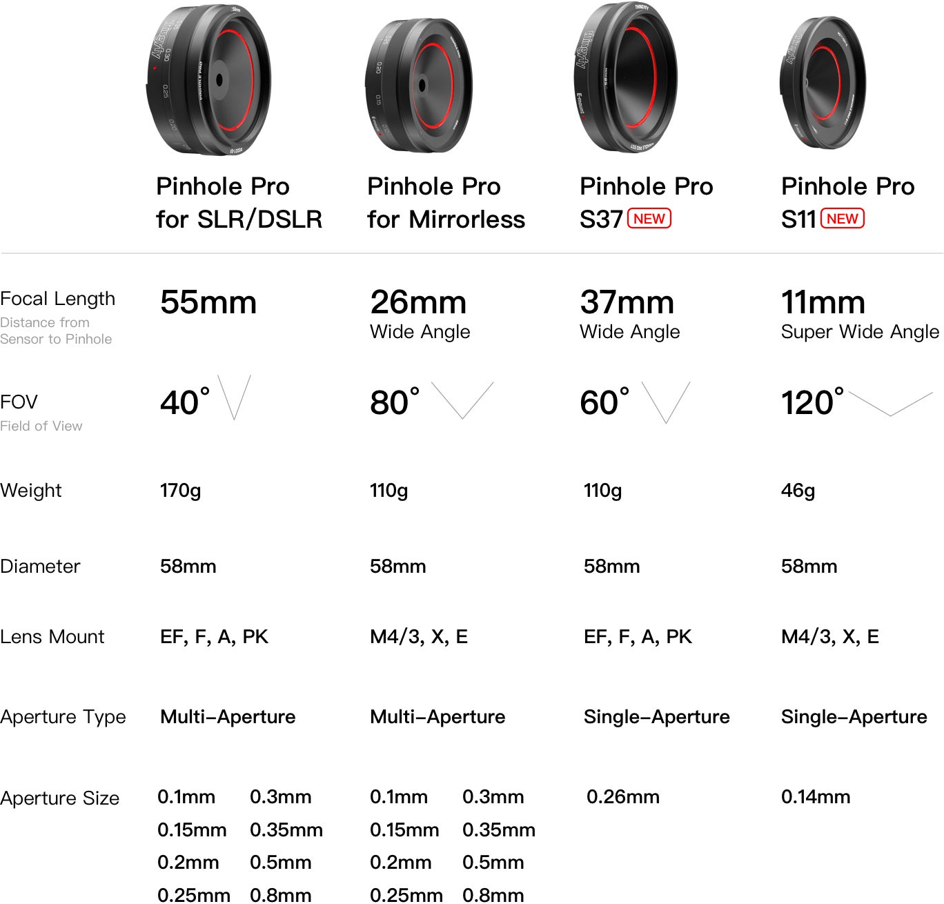 ※ Pinhole Pro for SLR/DSLR以外はすべて広角レンズとなります。