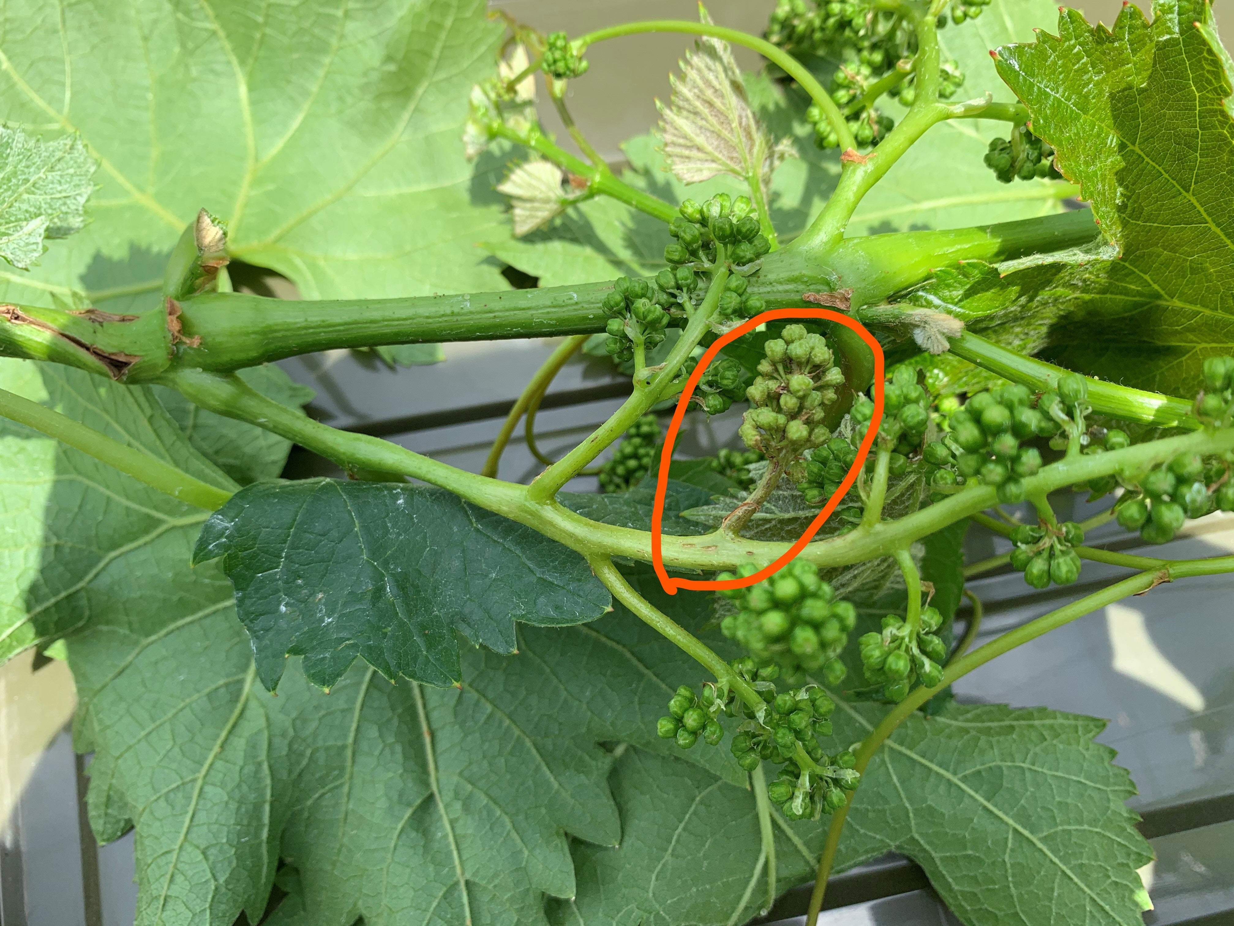 本日も多くのご支援とメッセージありがとうございます。今日はぶどうの病気について紹介したいと思います。写真の赤丸の部分が病変しているのが分るでしょうか?これは『ベト病』といって高温多湿の気候条件で発生する病気(カビの一種)です。これこれを発見したら周辺の茎や葉をすべて取払って畑から持ち出して焼却します。放置してしまうと畑全体に広がってしまいます。広瀬園ではぶどうは通常の栽培方法で行っているので農薬散布で抑え込むこともできますが、大事をとって取り払いました。近年では気候がだんだんと高温多湿に推移しているので病気の発生も早くなっている気がします。実際この時期にベト病が発生するのを見たのは初めてです。見つかったのがこれだけでしたので問題はないと思いますがこれからも注視していきます。
