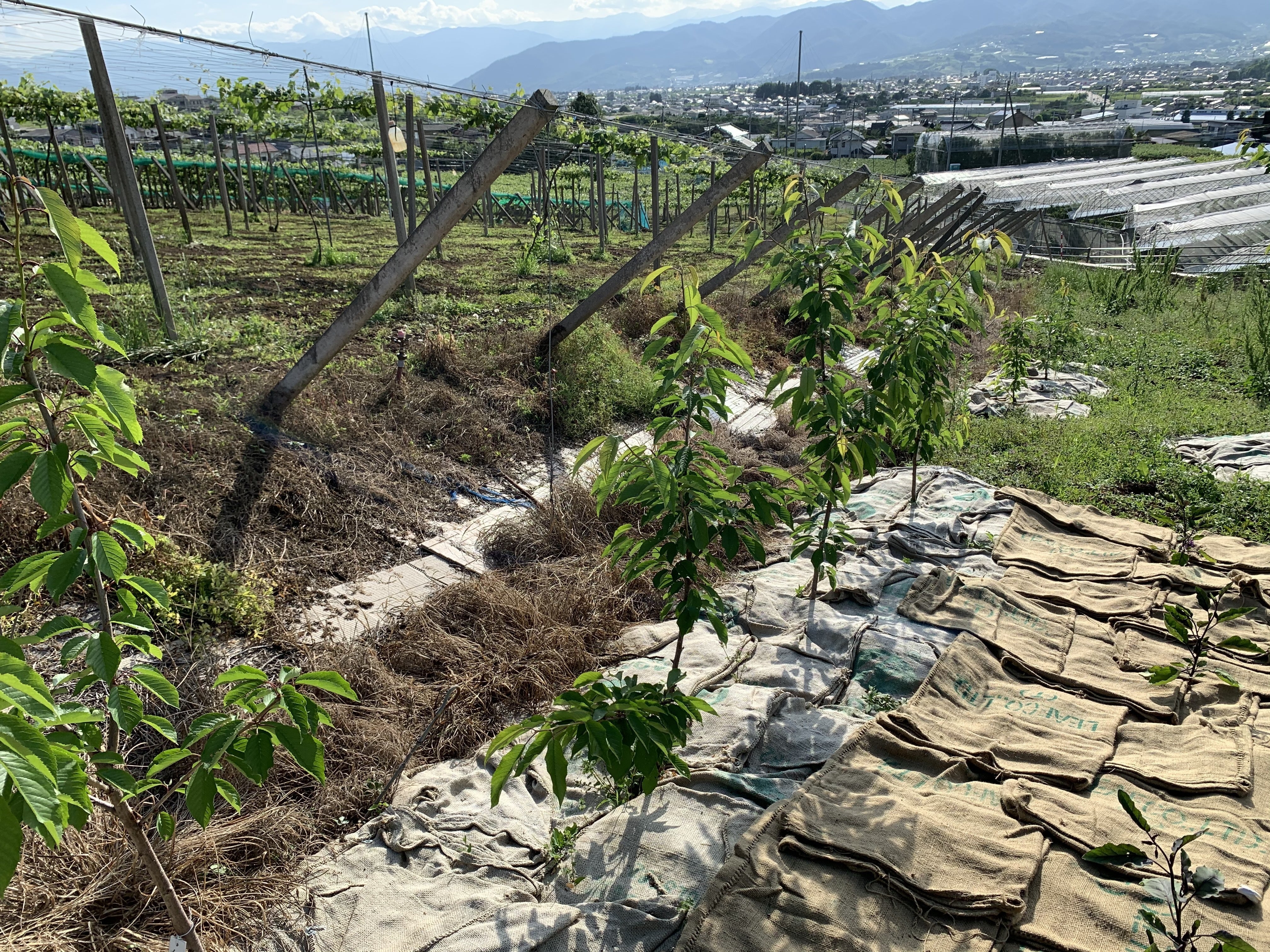 本日も多くのご支援とメッセージありがとうございます。今回はさくらんぼの苗木の管理のお話をしたいと思います。写真の苗木は植えてから2年経った苗木です。さくらんぼは非常に成長が遅く実を付けるのは早くても3年から4年後です。成木として一定量さくらんぼが収穫できるようになるのは8年ほど掛かってしまいます。長い期間をかけて大切に育てるので立派な成木になってくれると本当にうれしいですね!苗木は小さいうちに周辺に雑草が生えると雑草に負けて枯れてしまいます。そこで広瀬園では木の周りに麻袋を敷いて雑草が生えないようにしています。この麻袋は大豆を輸入している会社から頂いています。この麻袋を敷く事で他の効果も期待できます。根を乾燥から守ってくれたり、冬場の凍結防止、麻袋が土に帰ると堆肥にもなります。半年ほどで腐って土に帰るのでその都、度敷いています。自然の物なので土への影響も無いのが良いですね!