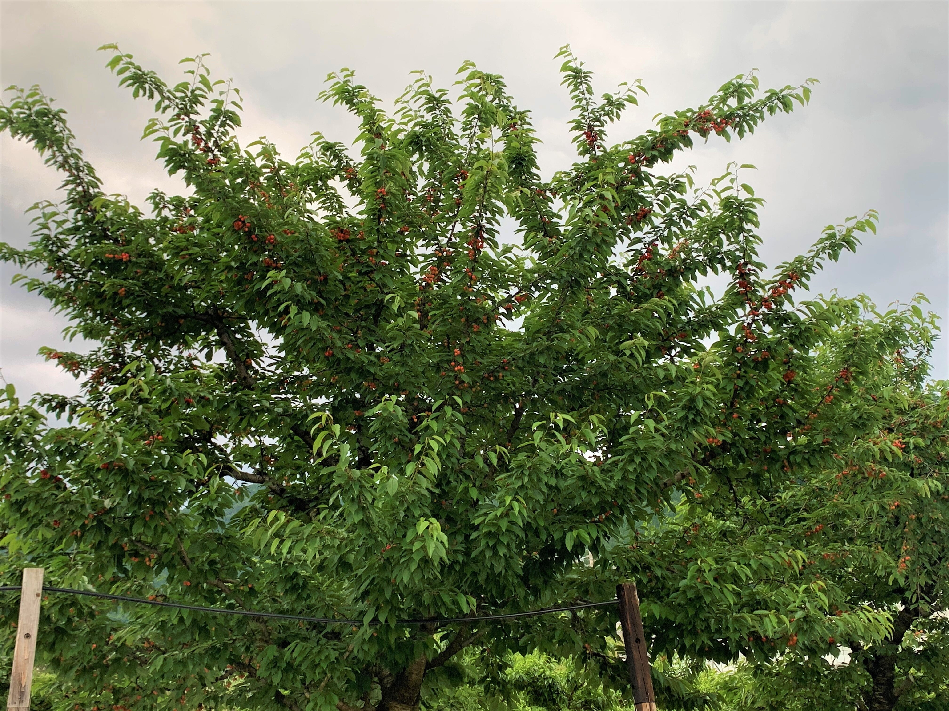 本日も多くのご支援とメッセージありがとうございます。今回はさくらんぼがどんな様子かお伝えします。これは『紅秀峰』という品種です。各枝に結構実が付いていますね!この品種は佐藤錦が元になっているのでとても甘く、実もしっかりしているので食べ応えも十分です。もう大分甘くなっていますが、まだまだ甘くなります!