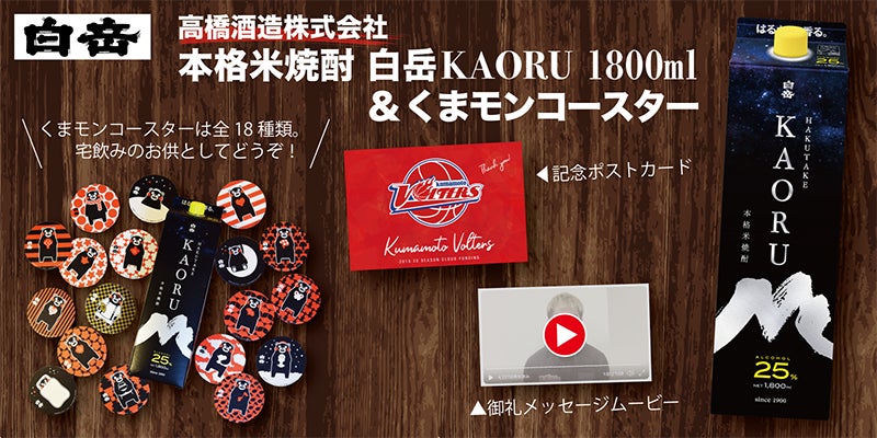 (内容)本格米焼酎 白岳 KAORU (1800ml)、くまモンコースター18枚、基本リターン(選手からのお礼メッセージムービー+ご支援記念のポストカード)