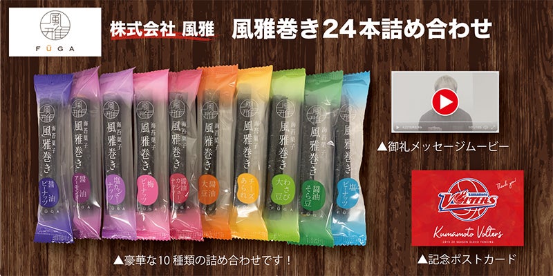 (内容)風雅巻き24本(醤油大豆…3本/醤油ピーナッツ…3本/塩ピーナッツ…3本/わさび大豆…3本/醤油そら豆 …2本/梅ピーナッツ…2本/チーズあられ…2本/醤油アーモンド…2本/醤油カシューナッツ…2本/塩カシューナッツ…2本)、基本リターン(選手からのお礼メッセージムービー+ご支援記念のポストカード)
