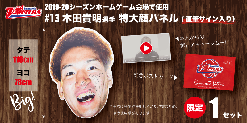 基本リターン(選手からのお礼メッセージムービー+ご支援記念のポストカード)に加えて、2019-20シーズンのホームゲーム会場で使用されていた特大顔パネルに選手の直筆サインを入れたものをお届けいたします。