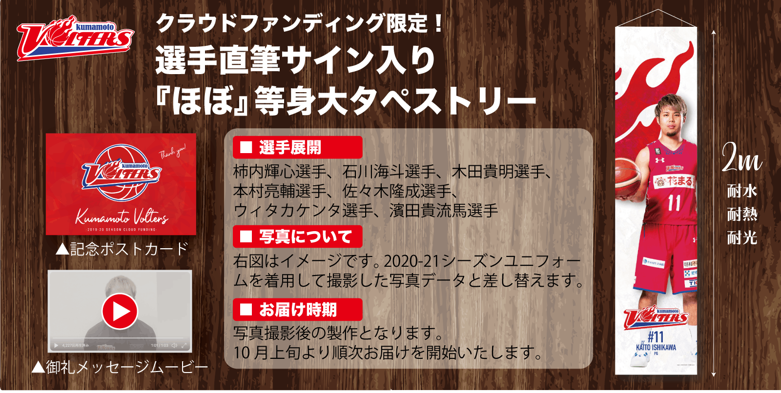 2020/06/29 20:00いつも熊本ヴォルターズの活動にご協力いただき、ありがとうございます。熊本ヴォルターズのクラウドファンディング『熊本とともに』projectは、皆様のお力添えをいただき、現在目標に対して138%の達成状況です。温かいご支援、誠にありがとうございます。本日は、ご要望の声も大きかった追加リターンを3種類公開させていただきました。本人直筆サイン入り『顔Tシャツ』今回のクラウドファンディング限定商品、選手の『顔』を大きくプリントしたTシャツです。全てに、お選びいただいた選手本人の直筆サインを入れてお届けします。選手直筆サイン入り『ほぼ』等身大タペストリー存在感抜群のBigサイズ!クラウドファンディング限定で、直筆サイン入りの『ほぼ』等身大タペストリーをご用意いたしました。直筆サイン入り『ほぼ』等身大タペストリー 2020-21シーズン契約選手セットズラリと並べると、壁一面にヴォルターズの選手が…!迫力満点間違いなし!2020年9月上旬時点で契約が決定している選手全員分のタペストリーに直筆サインを入れて、セットでお届けします。*お届けする種類(本数)は、2020年9月上旬時点で契約が決定している選手の人数分となります。(2019-20シーズン実績:12選手)昨年実績より若干前後する場合もございますので、予めご了承ください。またオフィシャルパートナー様の商品も、お陰様で多くの方にお選びいただいております。是非ご覧いただき、パートナー企業さまへのご支援も宜しくお願いいたします。引き続き、熊本ヴォルターズへ温かいご支援のほど、宜しくお願い申し上げます。 もっと見る