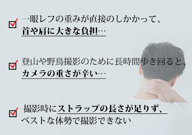 これだけの重さを首に下げて長時間歩き回ったら、首や肩には大きな負担…
