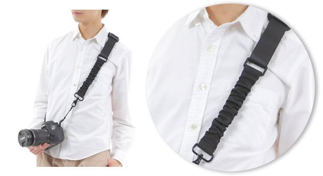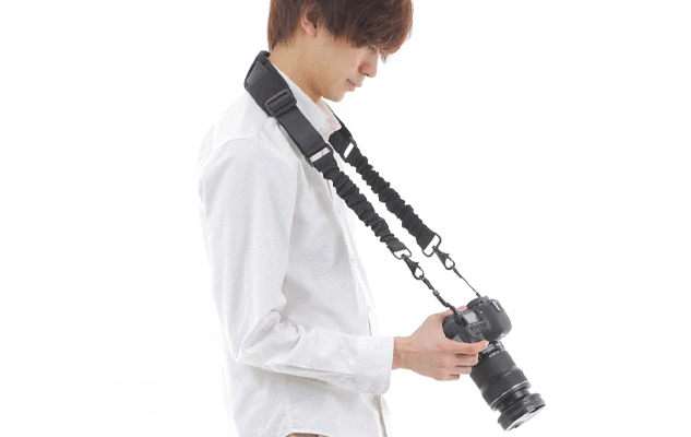 【BOOMR(ブーマー)】は、軍事用の銃に付けて使われたバンジースリングを採用し、伸縮コードで首の負担を軽減するカメラストラップです。