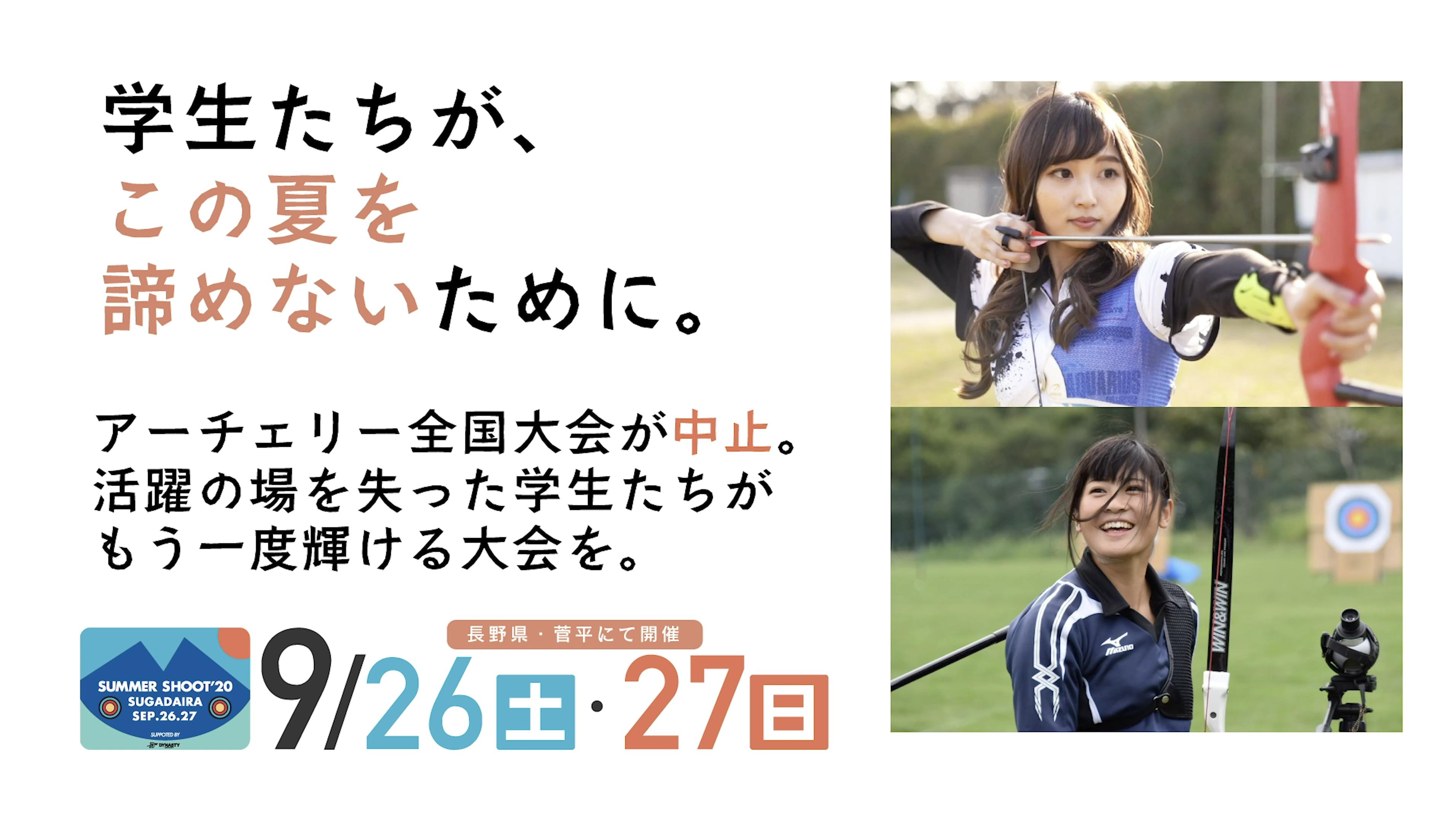 有志でこの大会を開催しようと手探りながら準備をしています。手探りであるがゆえにアーチェリー界の皆様にはご心配や、ご迷惑をおかけしていることもあります。そんな中ご協力やアドバイスをしていただける方々もいらっしゃり本当に感謝しております。開催までに、新型コロナの対策・試合運営の下地作り・選手の募集・保護者の方々のご協力・・・。まだまだ至らない所はたくさんありますが、ただ、アーチェリーを通して、この夏の大会ができなかった学生の皆さんに何か大人たちからギフトを贈れるんだということを、この「厳しい状況の中でも」大人たちにやれることがまだまだあるんだということを、我々から、伝えていきたいと思っております。生徒・学生たちの将来の進路のため、人生経験での最高の瞬間をつくるため。彼らをヒーローにしたいという思いは特別なものがあります。この大会を開催して見てもらった大人たちに何かを感じてもらい子供達には最高にカッコいい同年代に共感したり、羨ましく思ったりしてもらいたいのです。このプロジェクトにぜひ共創者として名乗りを挙げてもらえませんでしょうか?