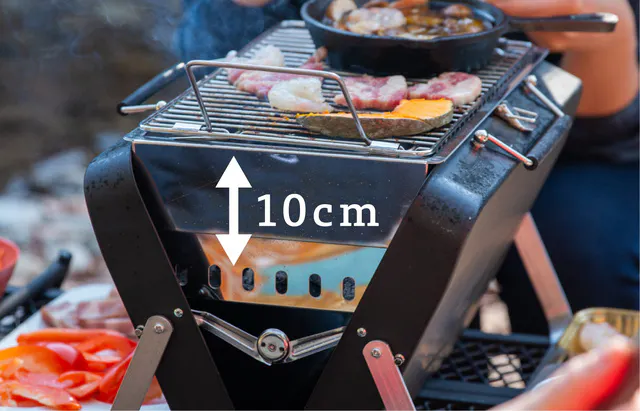 焼き網と炭受けの距離は約10cm。お肉や野菜を美味しく焼くのに適切な距離に設計されています。