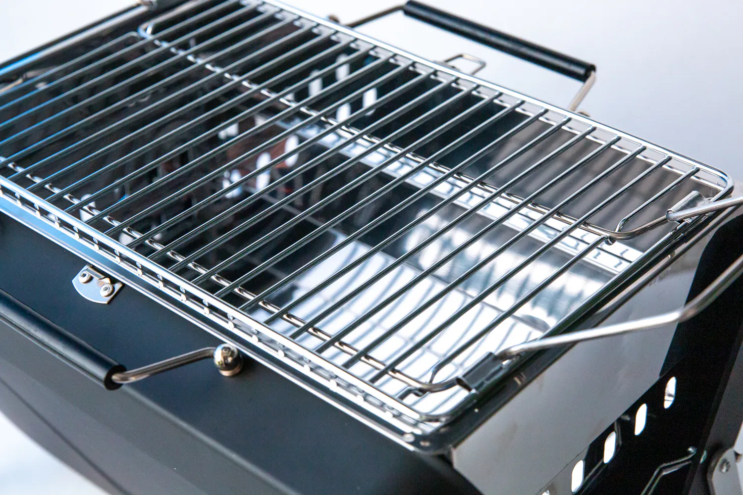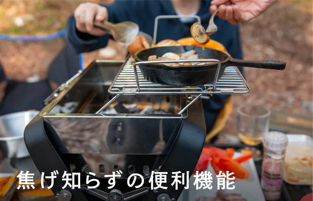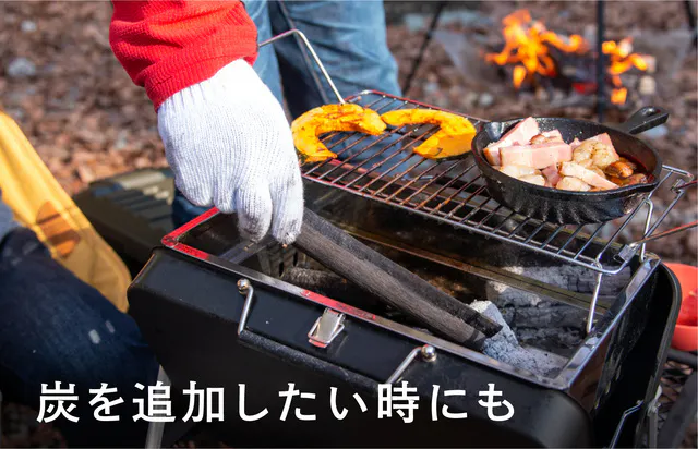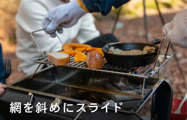 この機能は、途中で炭を足したい時にも役立ちますよ! 網の上の食材はそのままにスライドするだけで作業面積を広く確保することが出来るので、焦らずに作業が可能です。