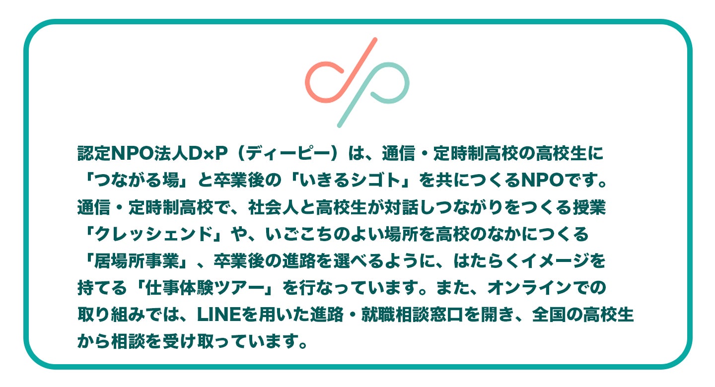 D×Pでは、生きづらさを抱えた10代に向けてオンラインでの進路相談事業を行なっています。