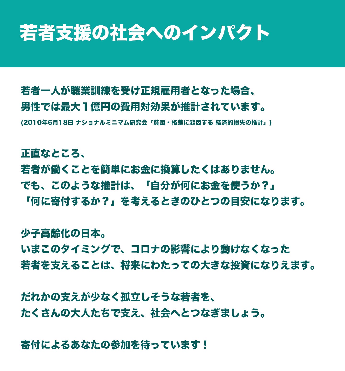・達成後2020年12月頃までに、合計6600時間のサポートを約330名の若者に提供します。
