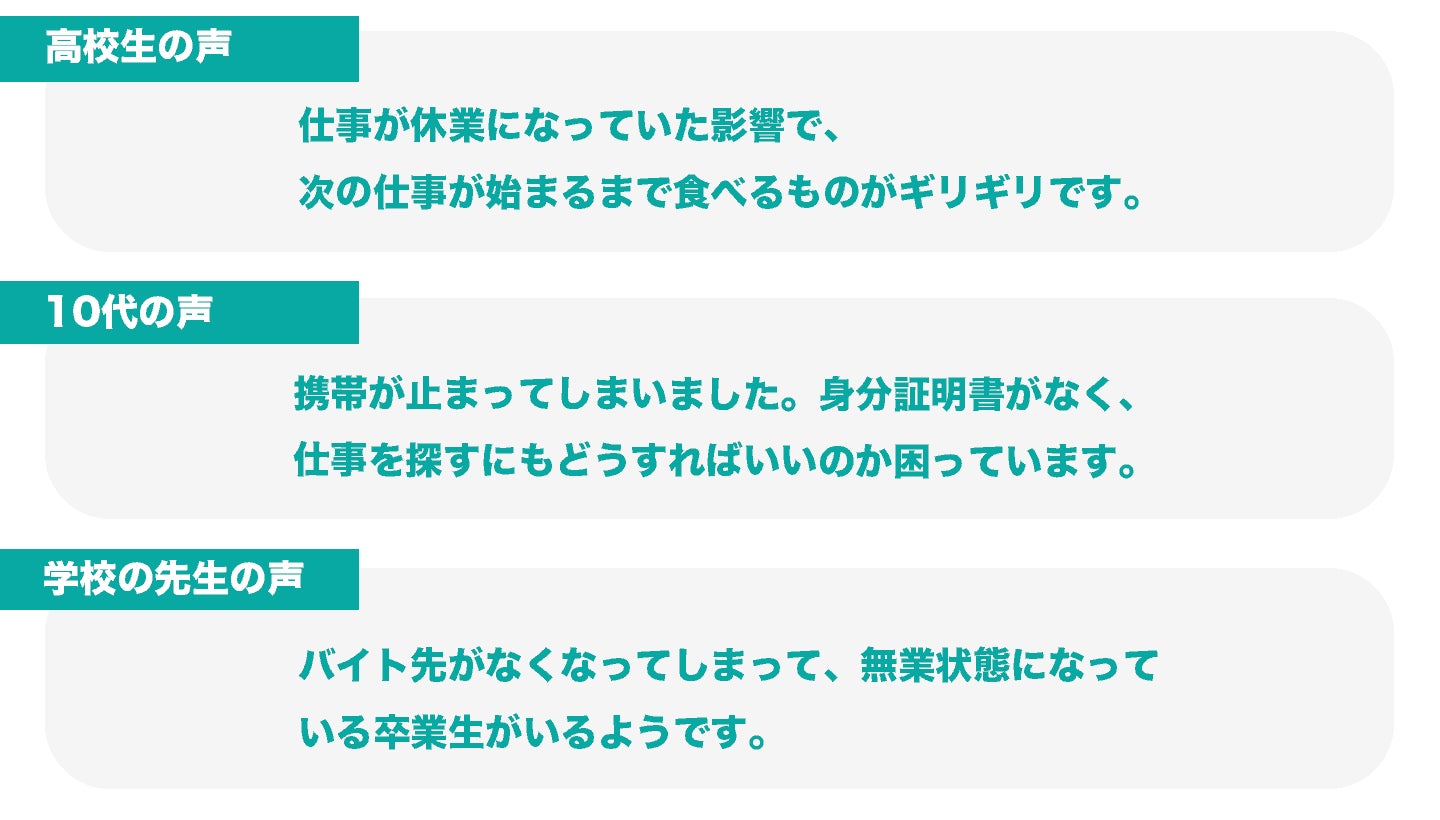 日本では、すでに内定取消しとなった若者、シフトが減らされて明日の生活費に困っている若者の声が聞かれています。