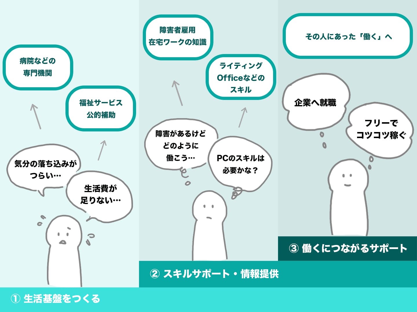これからの就労支援は、ひたすら「雇用してもらうこと」を目指すのではなく、福祉やケアの視点を取り込んだ、多様な視点からなされることが望ましいと考えます。
