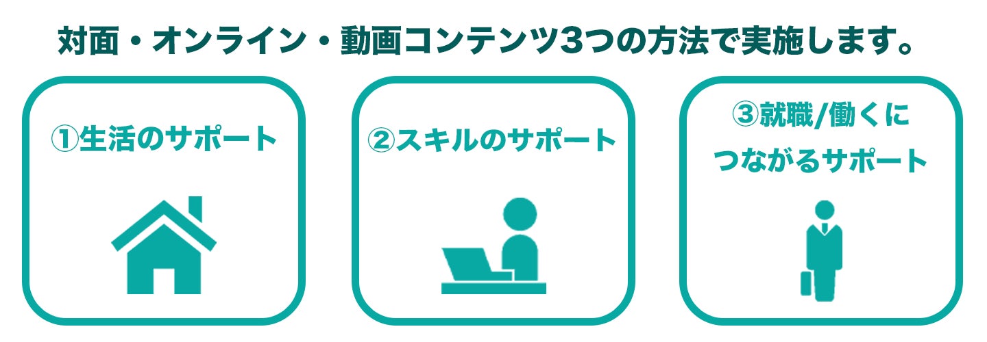 これらの3種類のサポートを、対面・オンライン・動画コンテンツの3つの方法で実施します。