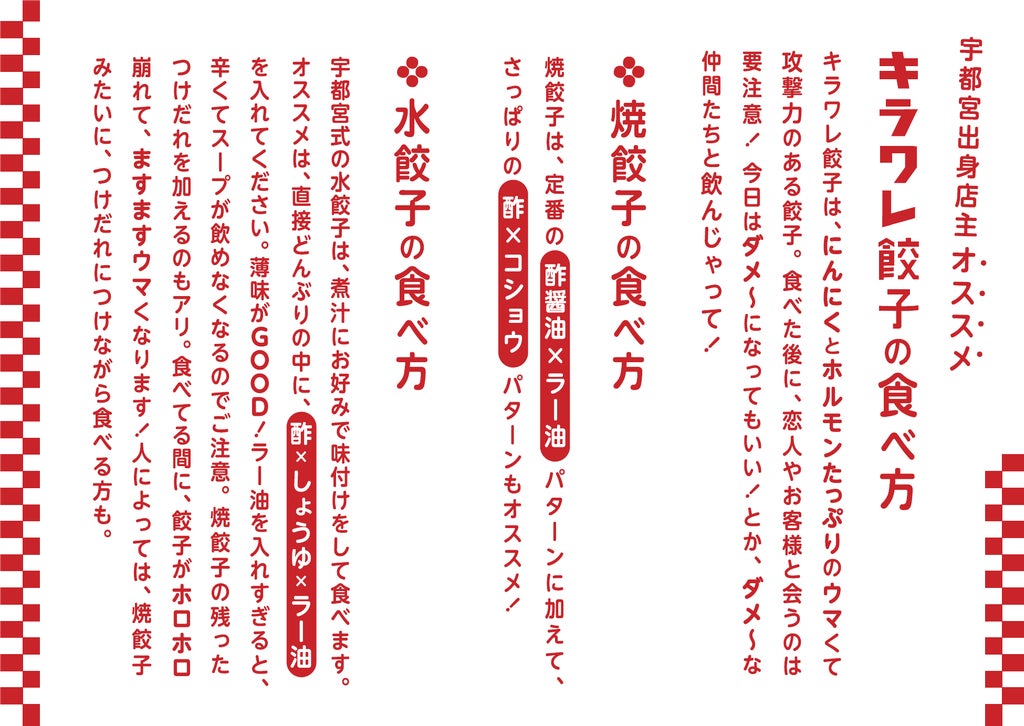 キラワレ餃子は、にんにくとホルモンたっぷりのウマくて攻撃力のある餃子。食べた後に、恋人やお客様と会うのは要注意です!今日はダメ~になってもいい日や、ダメ~な仲間たちとの飲みの日限定の、餃子好きにはたまらなさすぎる餃子です!